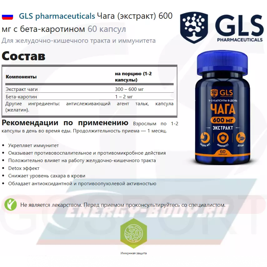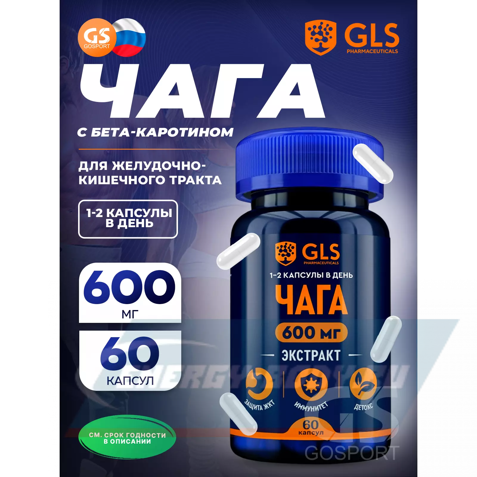 GLS pharmaceuticals Чага (экстракт) 600 мг с бета-каротином 60 капсул — Для желудочно-кишечного тракта, детокса и иммунитета