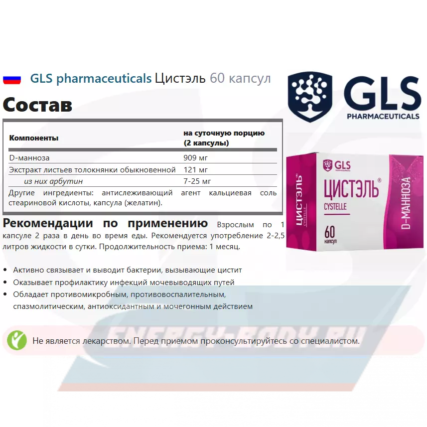 Действие Цистэль определяется активностью компонентов, входящих в его состав: D-маннозы и стандартизированного экстракта листьев Толокнянки.