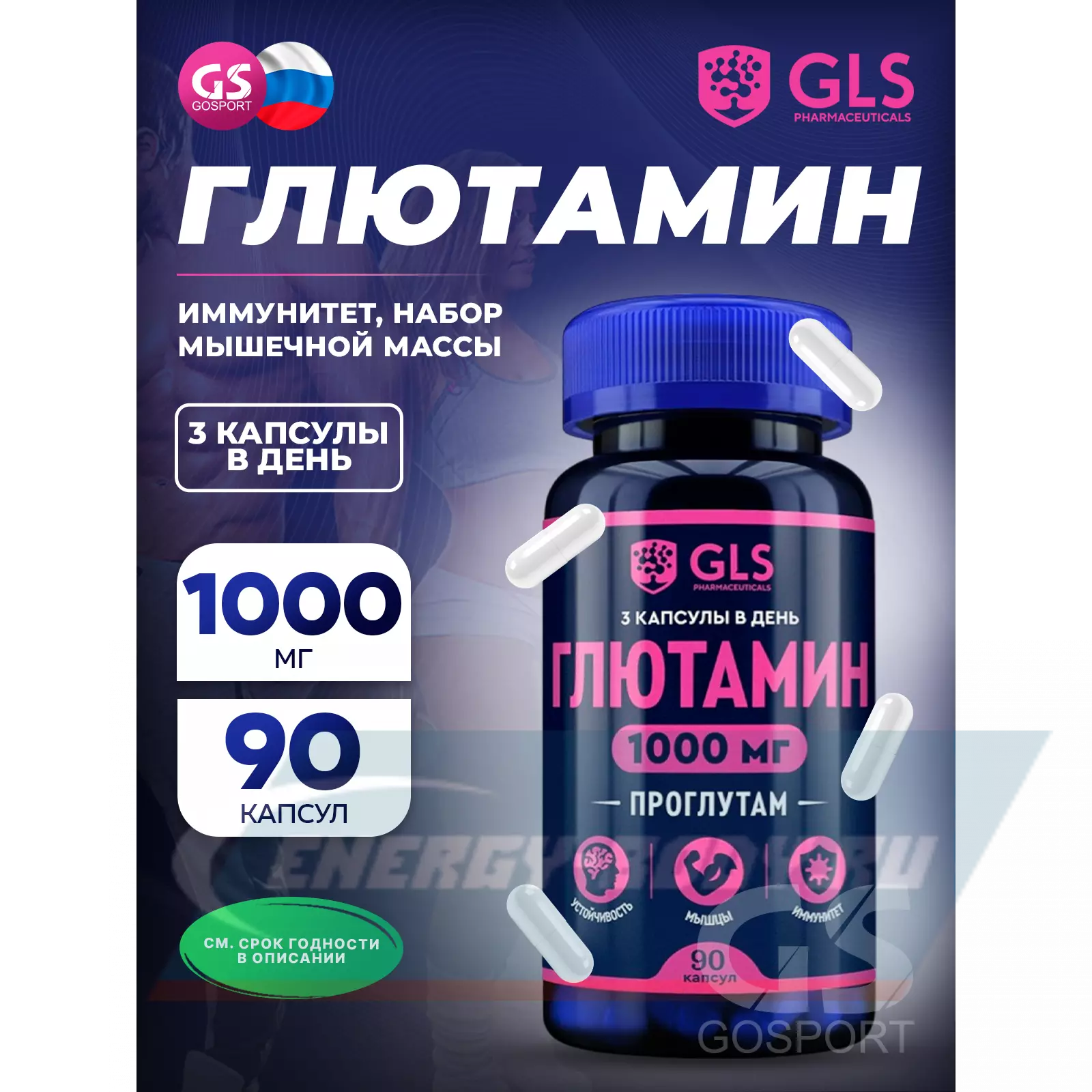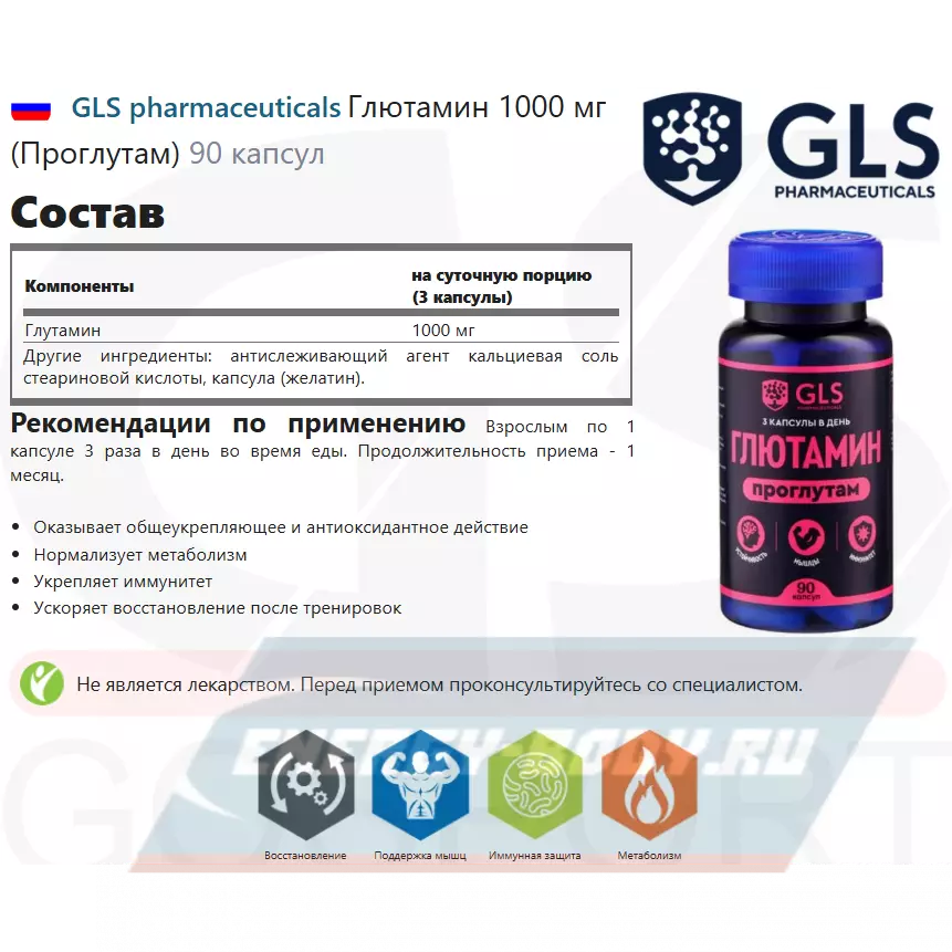 GLS pharmaceuticals Глютамин 1000 мг (Проглутам) 90 капсул — для восстановления мышц, иммунитета и метаболизма