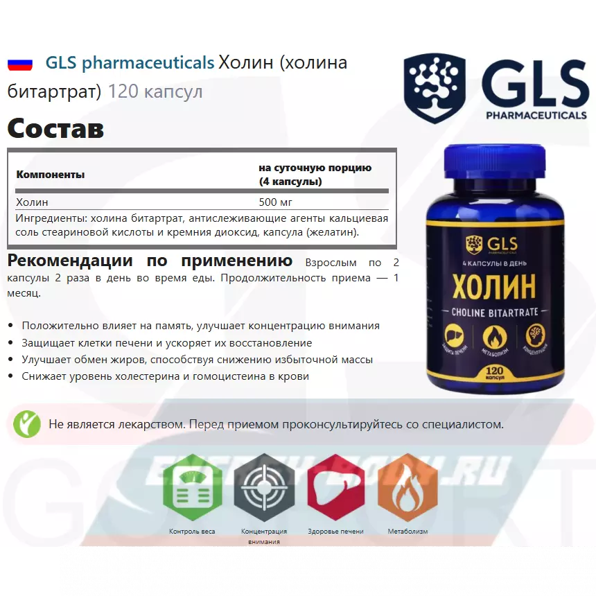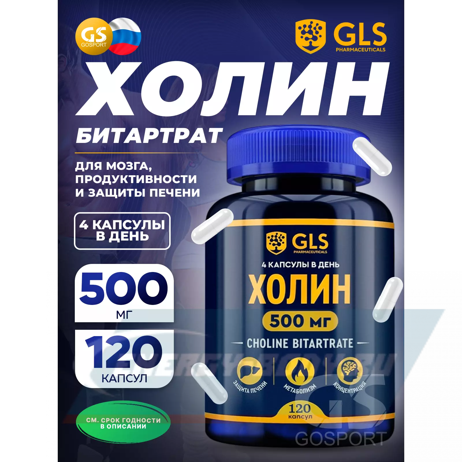GLS pharmaceuticals Холин (холина битартрат) 120 капсул — Для печени, метаболизма и концентрации внимания