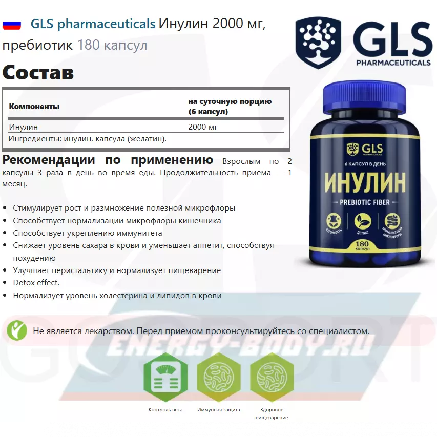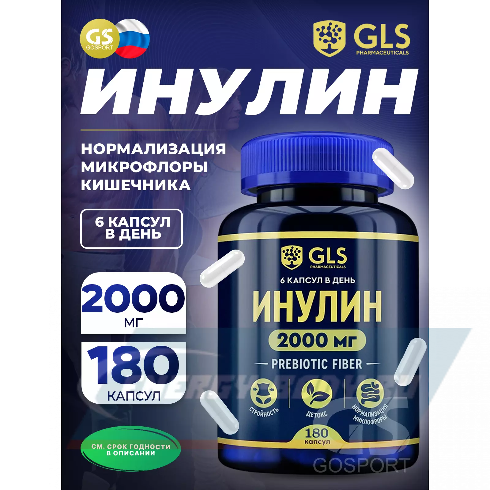 GLS pharmaceuticals Инулин 2000 мг, пребиотик 180 капсул — для микрофлоры кишечника, уменьшения аппетита и детокса
