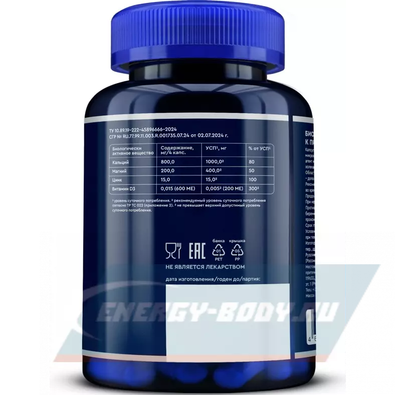 Ингредиенты: кальция карбонат, антислеживающией агент микрокристаллическая целлюлоза, магния оксид, антислеживающией агент кальциевая соль стеариновой кислоты, цинка цитрат, холекальциферол, капсула (желатин).