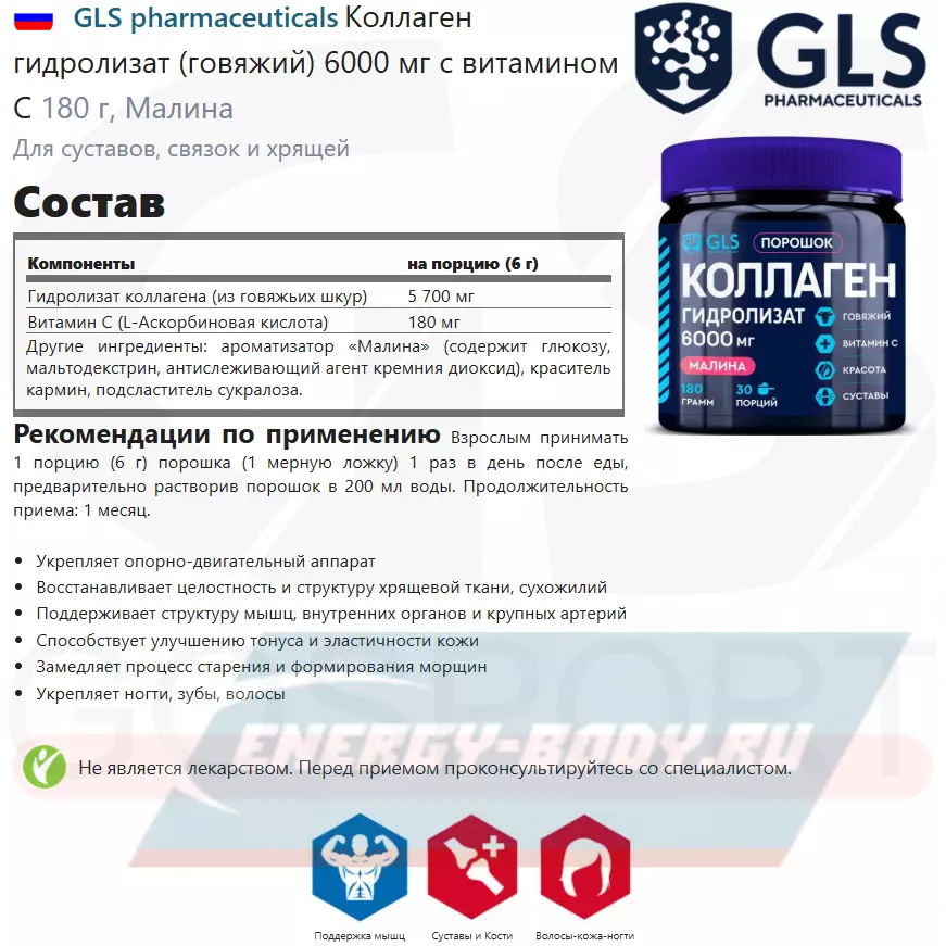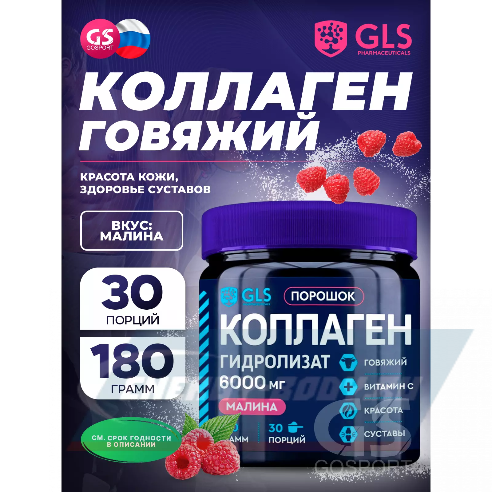 GLS pharmaceuticals Коллаген гидролизат (говяжий) 6000 мг с витамином С 180 г, Малина — Для суставов, костей и кожи