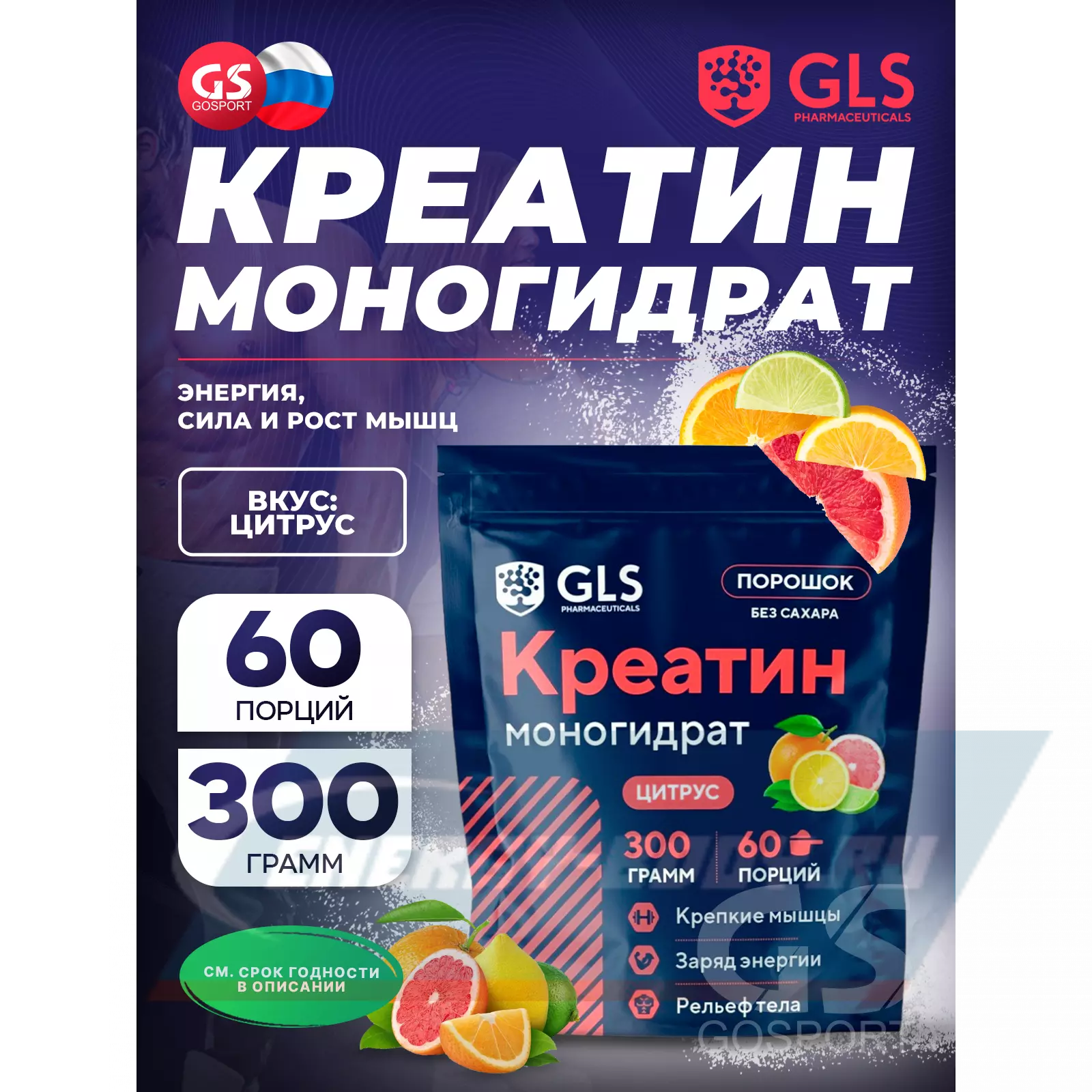 GLS pharmaceuticals Креатин моногидрат (Creatine Monohydrate) 300 г, Цитрус — Увеличивает силу, рост сухой мышечной массы и ускоряет восстановление