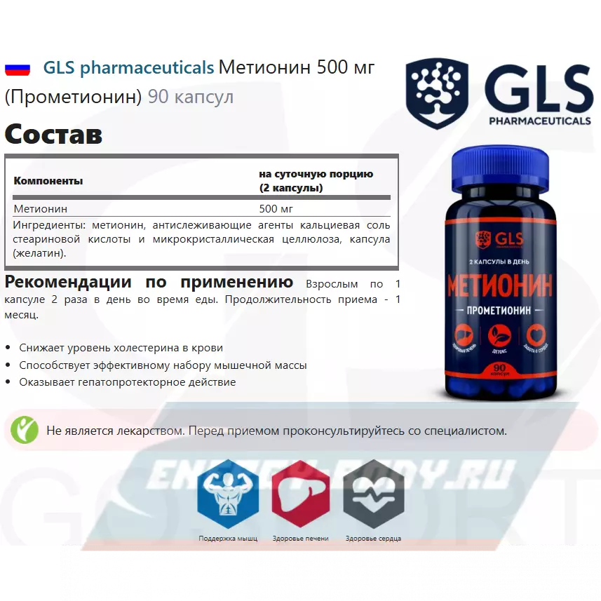 GLS pharmaceuticals Метионин 500 мг (Прометионин) 90 капсул — для здоровья печени, детокса и сердца