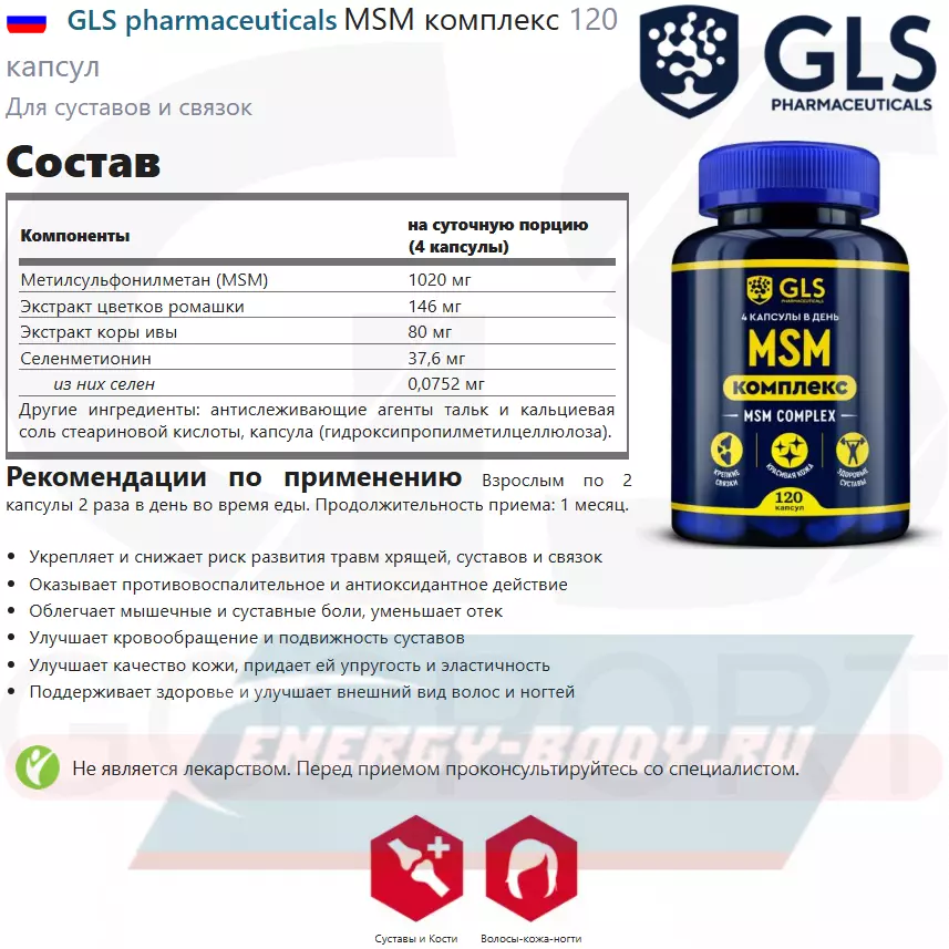 GLS pharmaceuticals MSM комплекс 120 капсул — Для суставов (Метилсульфонилметан, селен, экстракты ивы и ромашки)