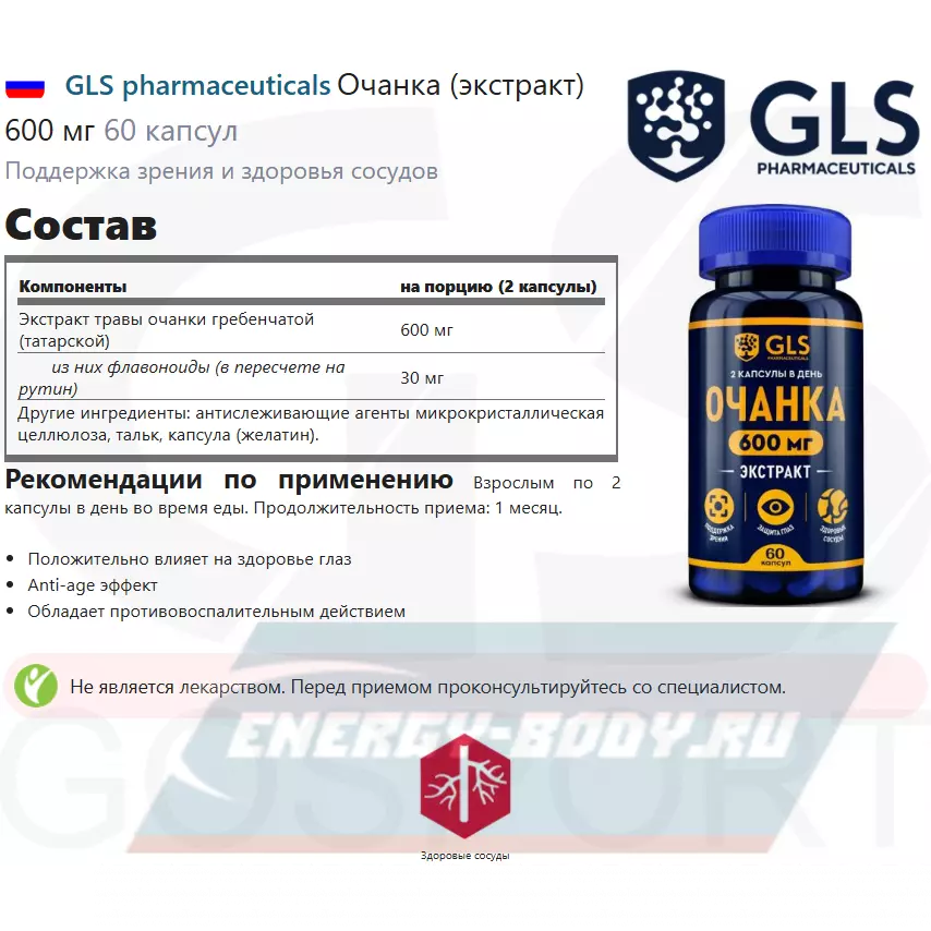 GLS pharmaceuticals Очанка (экстракт) 600 мг 60 капсул — Для зрения, здоровья глаз и сосудов