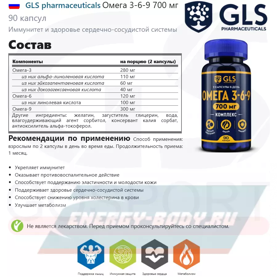 GLS pharmaceuticals Омега 3-6-9 700 мг 90 капсул — Для иммунитета, молодости кожи и сердечно-сосудистой системы
