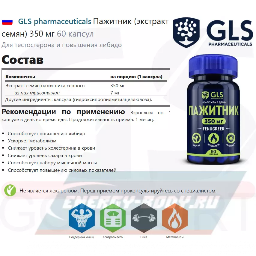 GLS pharmaceuticals Пажитник (экстракт семян) 350 мг 60 капсул — Для повышения либидо, метаболизма и иммунитета