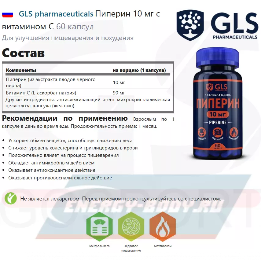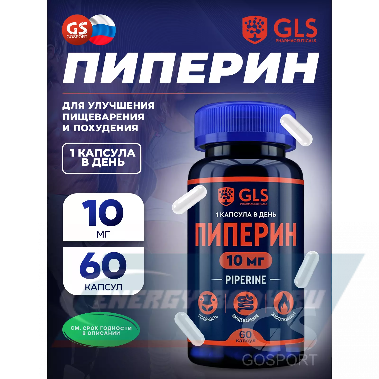 GLS pharmaceuticals Пиперин 10 мг с витамином С 60 капсул — Для снижения веса, пищеварения и обмена веществ