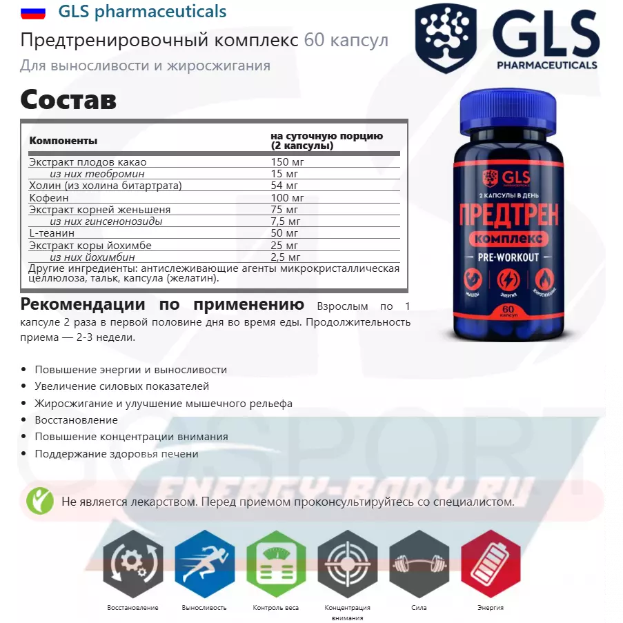 GLS pharmaceuticals Предтренировочный комплекс 60 капсул — для энергии, жиросжигания и силы
