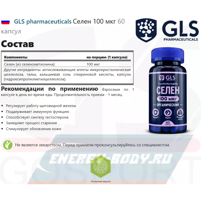 GLS pharmaceuticals Селен 100 мкг 60 капсул — Для щитовидной железы, иммунитета и молодости кожи