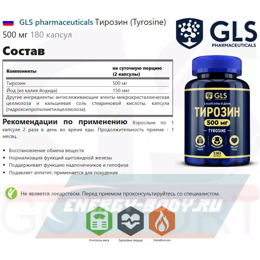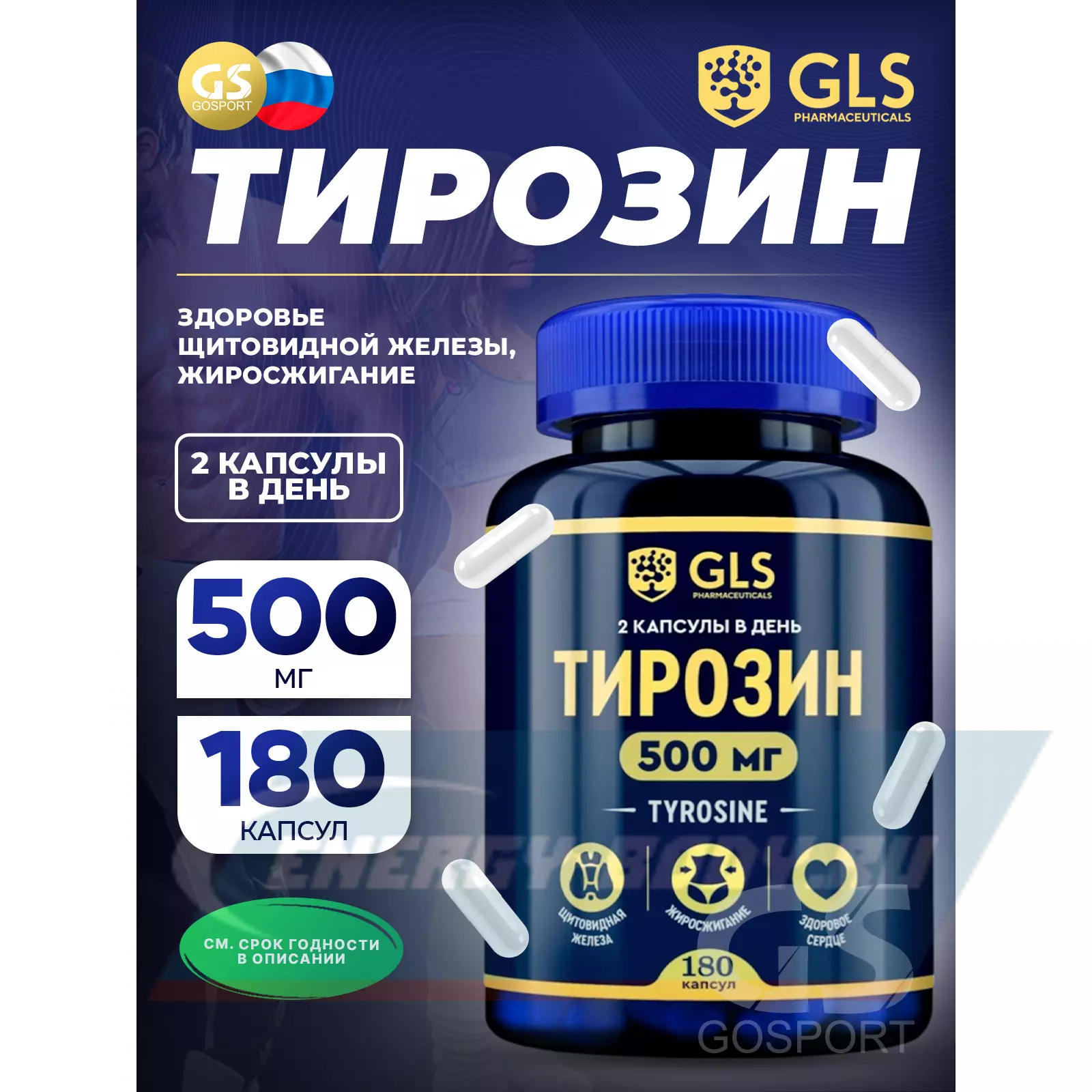 GLS pharmaceuticals Тирозин (Tyrosine) 500 мг 180 капсул — для щитовидной железы, снижения аппетита и сердца