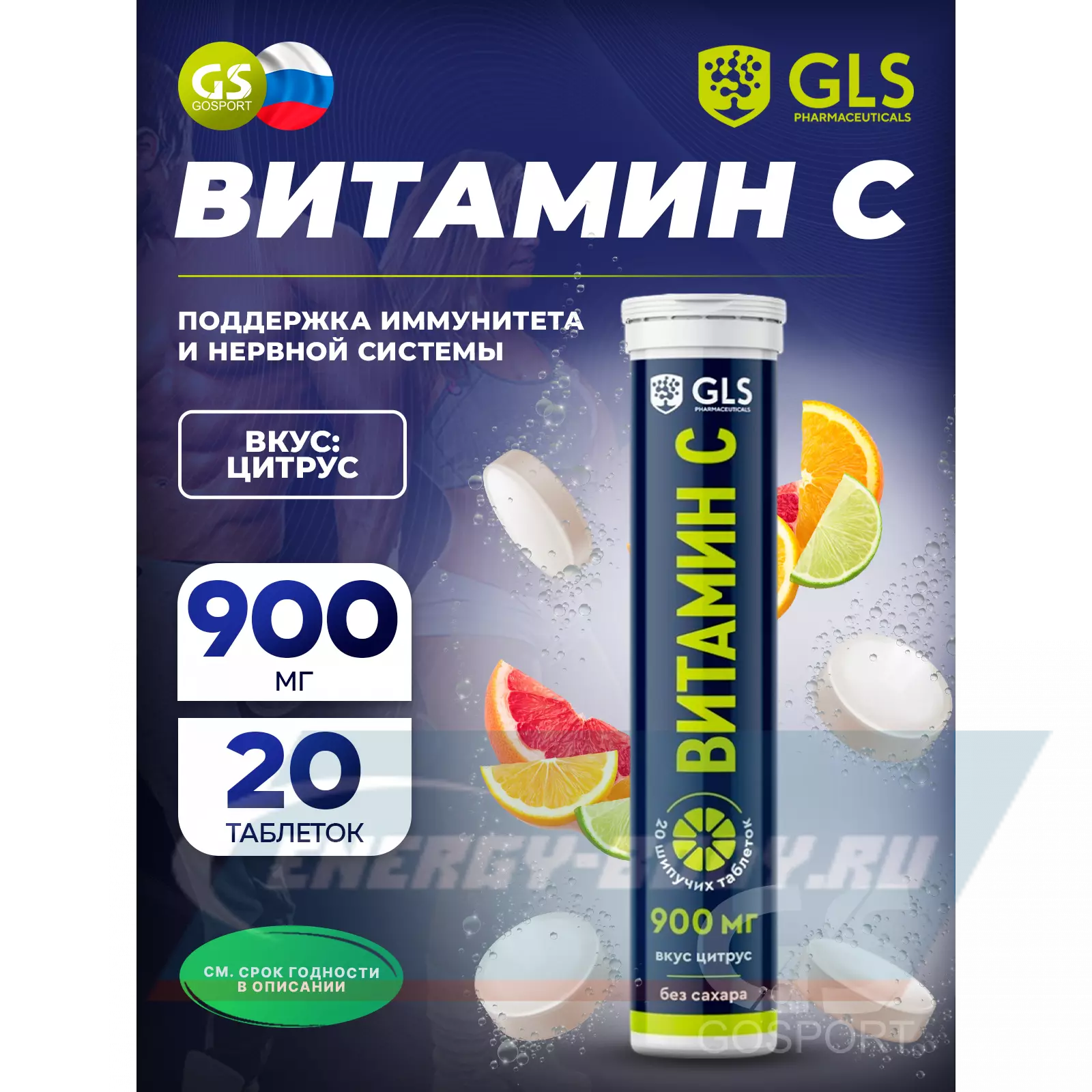 GLS pharmaceuticals Витамин С без сахара 20 шипучих таблеток, Цитрус — для иммунной системы, обмена веществ, антиоксидант