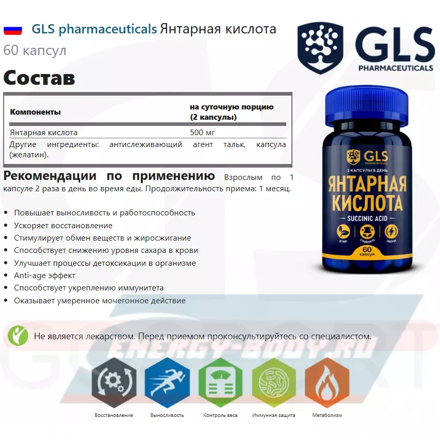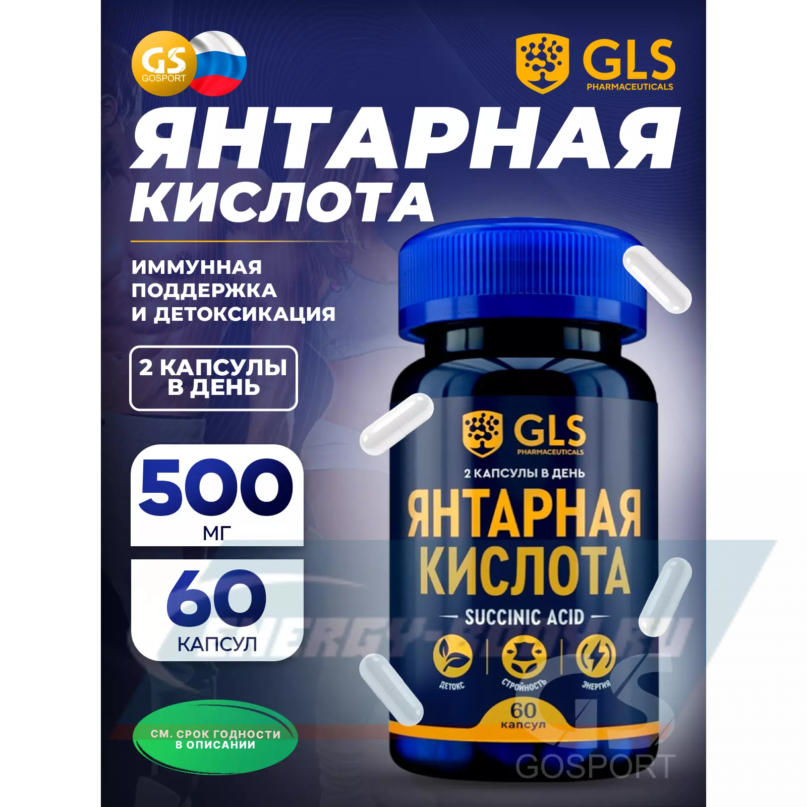 GLS pharmaceuticals Янтарная кислота 60 капсул — Для обмена веществ, жиросжигания и детокса