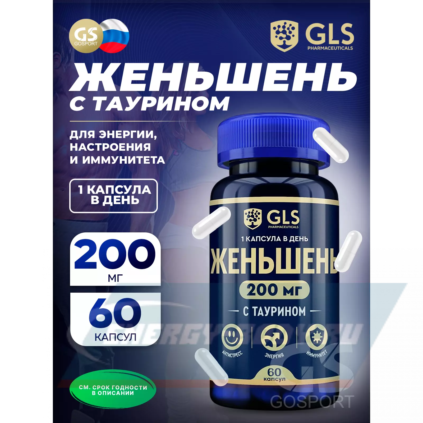 GLS pharmaceuticals Женьшень (экстракт корня) 200 мг с таурином 60 капсул — Для энергии, настроения и иммунитета