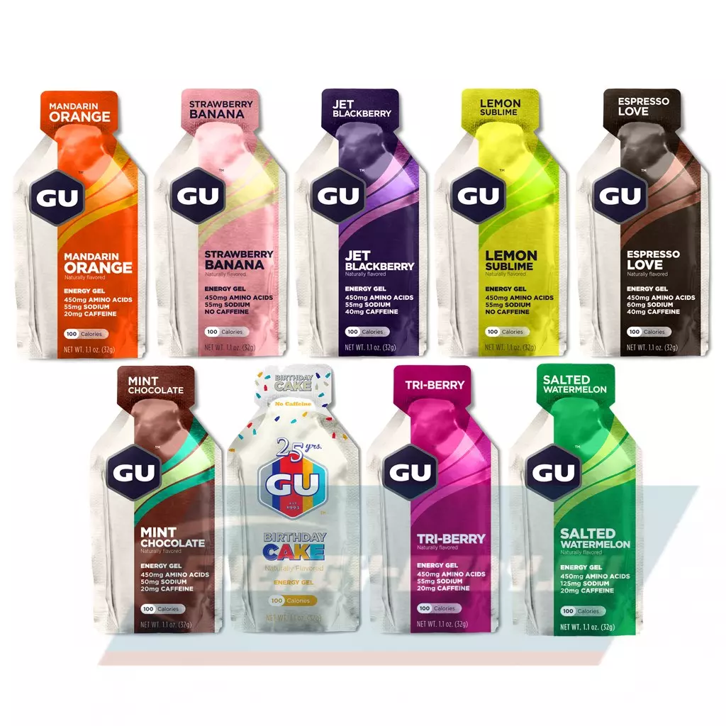 Созданный для ежедневных тренировок и соревнований, высококалорийный энергетический гель GU помогает поддерживать уровень энергии при продолжительной физической нагрузке. Пакет содержит 100 калорий, а углеводы (мальтодекстрин и фруктоза) используют не конкурирующие пути, чтобы помочь в обеспечении максимального углеводного поглощения и усваивания, одновременно не допуская проблем с желудком. Натрий, первичный электролит, теряющийся с потом, помогает поддерживать солевой баланс. Аминокислоты с разветвленной цепью (лейцин, валин, изолейцин), могут уменьшить умственную усталость и снизить риск повреждение мышц.