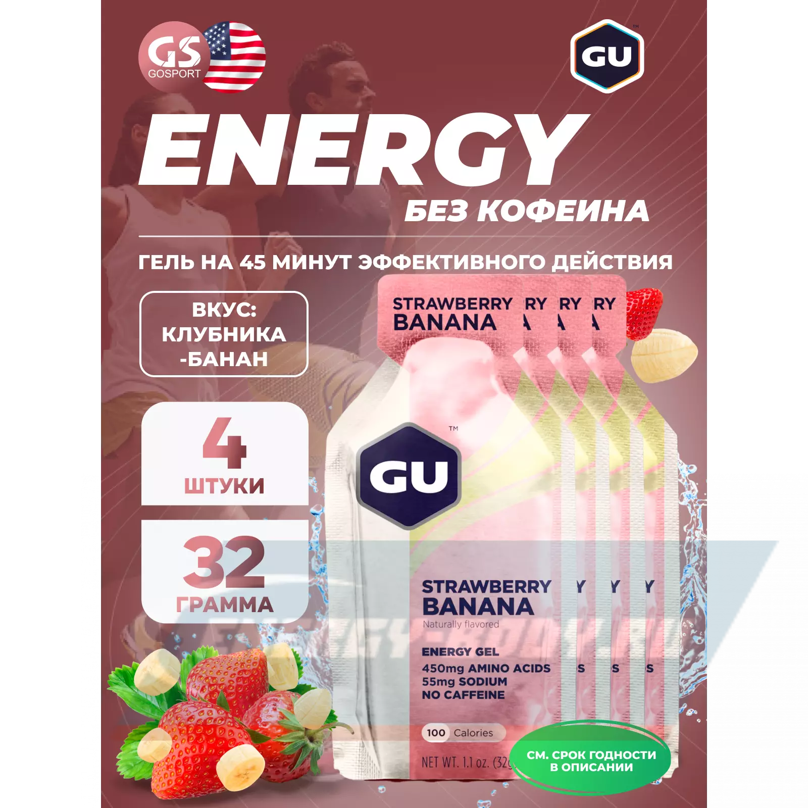 GU ENERGY GU Original Energy Gel no caffeine 4 x 32 г, Клубника-Банан — Высокая калорийность, Два вида углеводов, Лёгкий