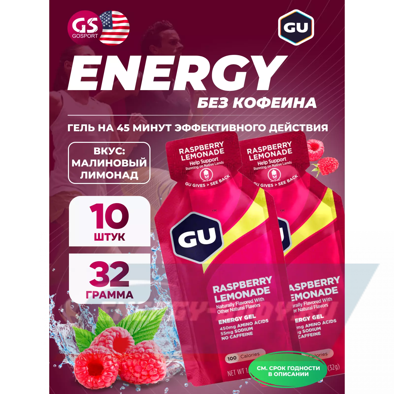 GU ENERGY GU Original Energy Gel no caffeine 10 x 32 г, Малиновый лимонад — Высокая калорийность, Два вида углеводов, Лёгкий