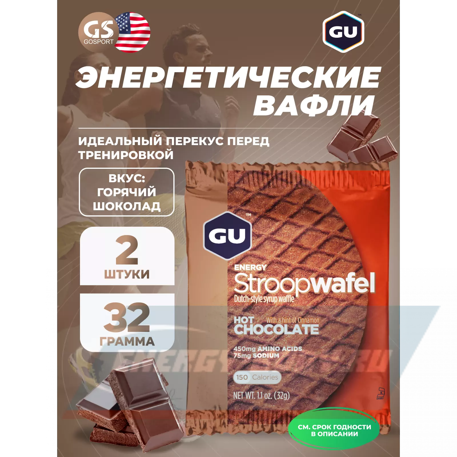 Созданные для ежедневного использования, до и во время тренировок и соревнований, мягкие вафли GU ENERGY STROOPWAFEL содержат все питательные вещества, необходимые для высокой производительности: комплекс простых и сложных углеводов (для немедленной и длительной энергии), незаменимые аминокислоты (для предотвращения умственной усталости и восстановления поврежденых мышц во время длительных мероприятий), а также электролиты (для восполнения того, что теряется с потом). Вафли имеют слой вкусного сиропа между двумя тонкими пластинками и индивидуально упакованы, чтобы их было легко взять на поездку или забег.