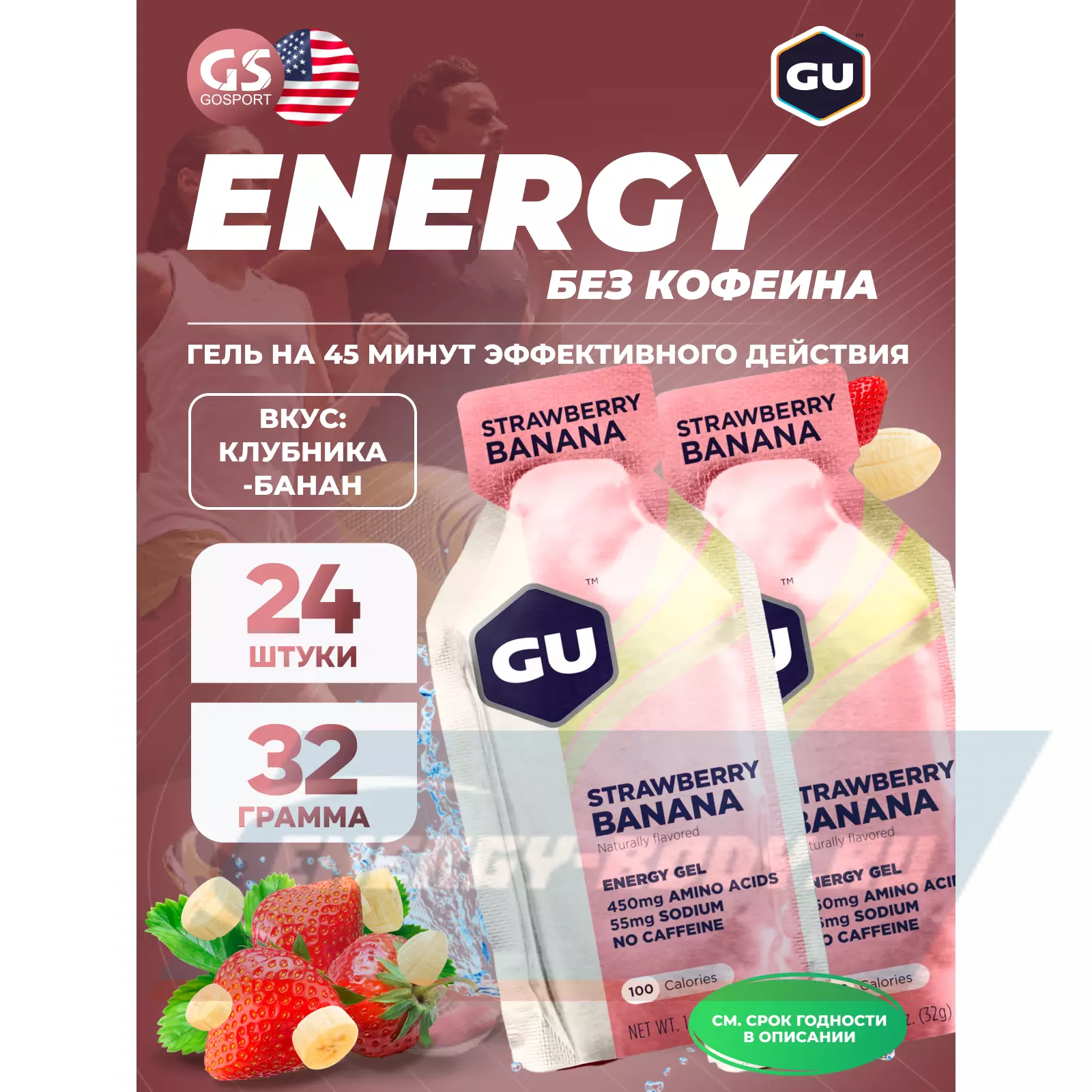 GU ENERGY GU Original Energy Gel no caffeine 24 x 32 г, Клубника-Банан — Высокая калорийность, Два вида углеводов, Лёгкий