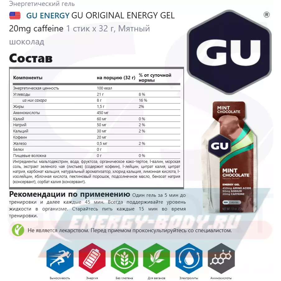 Созданный для ежедневных тренировок и соревнований, высококалорийный энергетический гель GU помогает поддерживать уровень энергии при продолжительной физической нагрузке. Пакет содержит 100 калорий, а углеводы (мальтодекстрин и фруктоза) используют не конкурирующие пути, чтобы помочь в обеспечении максимального углеводного поглощения и усваивания, одновременно не допуская проблем с желудком. Натрий, первичный электролит, теряющийся с потом, помогает поддерживать солевой баланс. Аминокислоты с разветвленной цепью (лейцин, валин, изолейцин), могут уменьшить умственную усталость и снизить риск повреждение мышц.