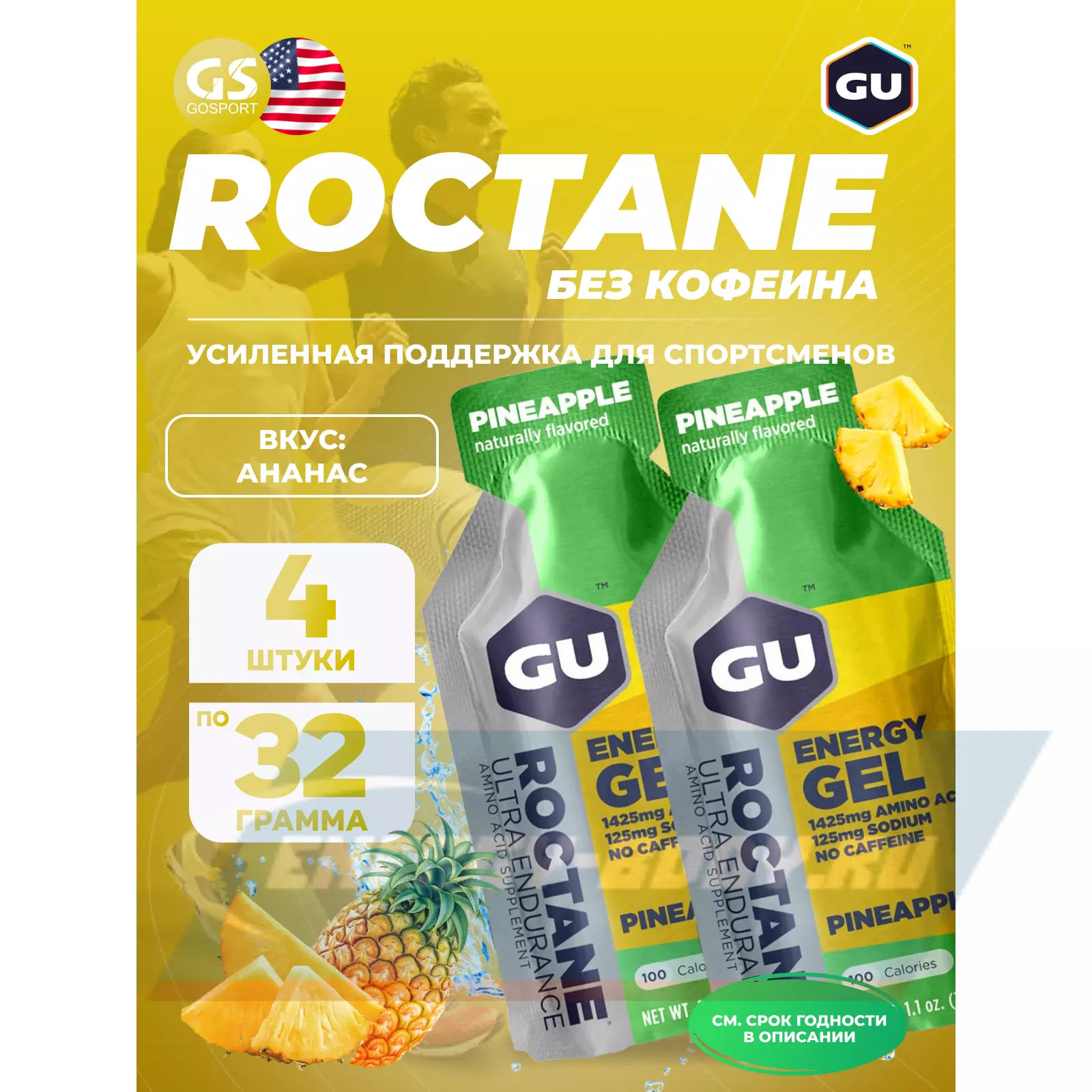 GU ENERGY GU ROCTANE Energy Gel no caffeine 4 x 32 г, Ананас — Для выносливости и водно-солевого баланса