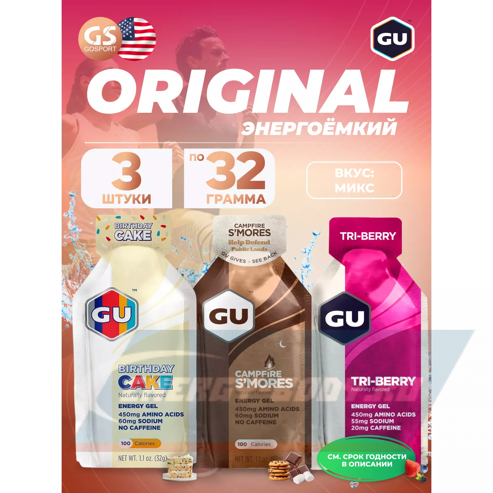 GU ENERGY Gel MIX 3 x 32 г, Ягоды,Печенье,Праздничный торт — Для выносливости и водно-солевого баланса