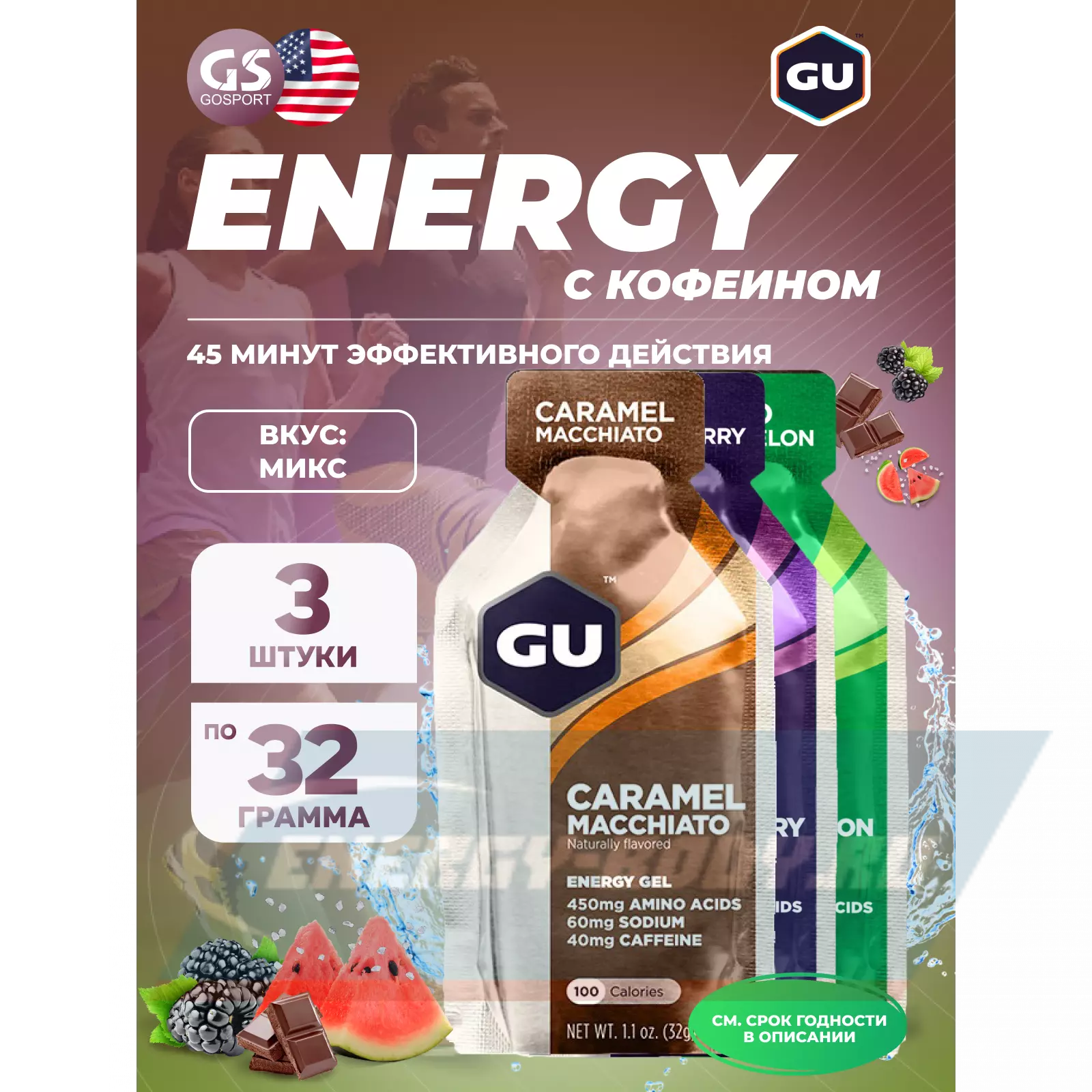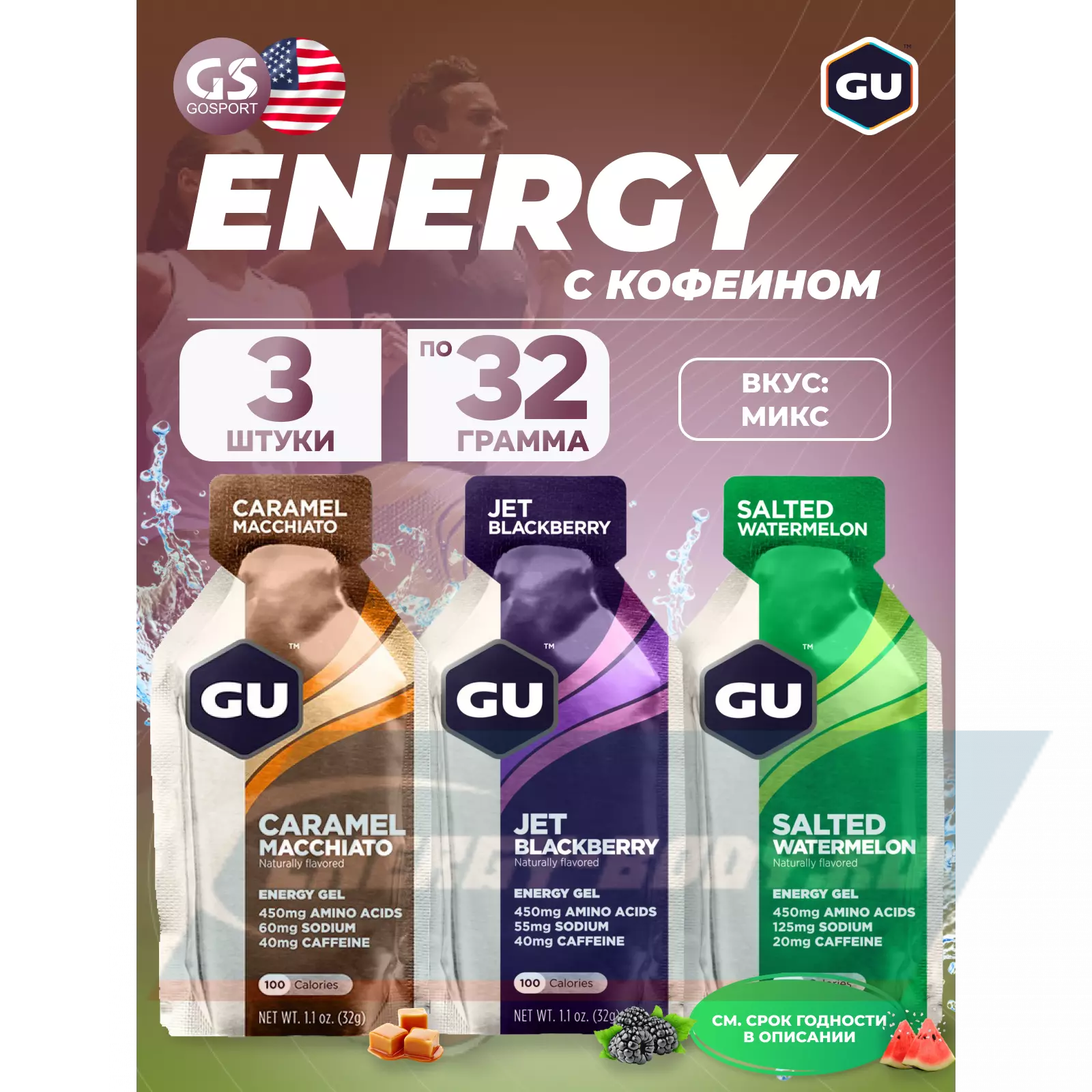 GU ENERGY Gel MIX 3 x 32 г, Карамель-Макиато, Ежевика Джет, Соленый Арбуз — Для выносливости и водно-солевого баланса