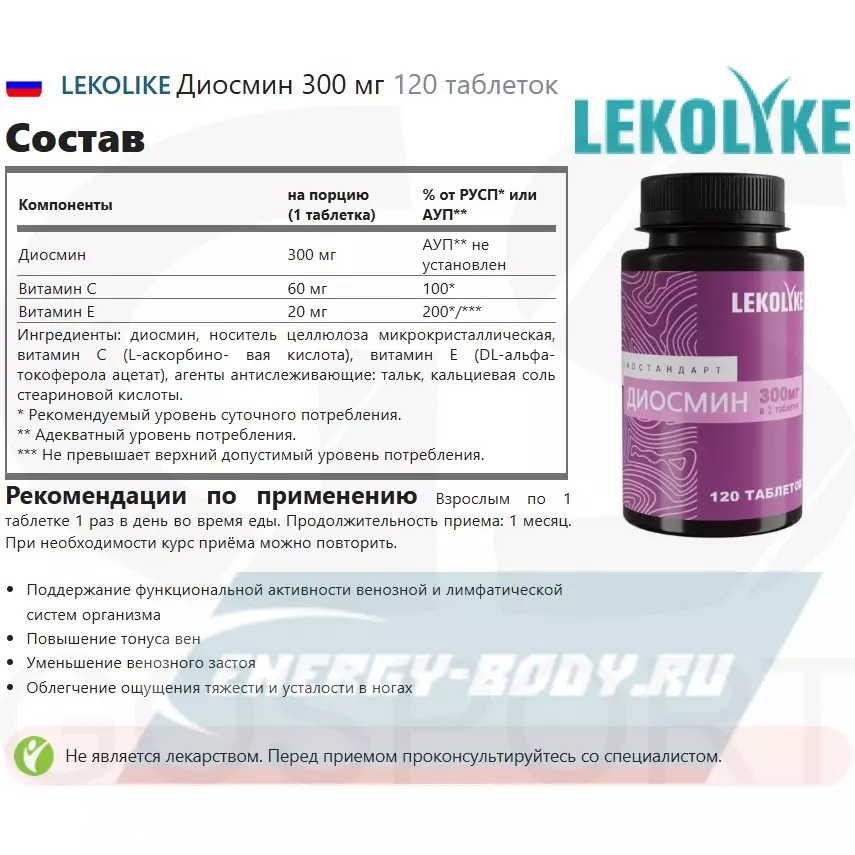 LEKOLIKE Диосмин 300 мг 120 таблеток — Повышение тонуса вен и облегчение тяжести в ногах