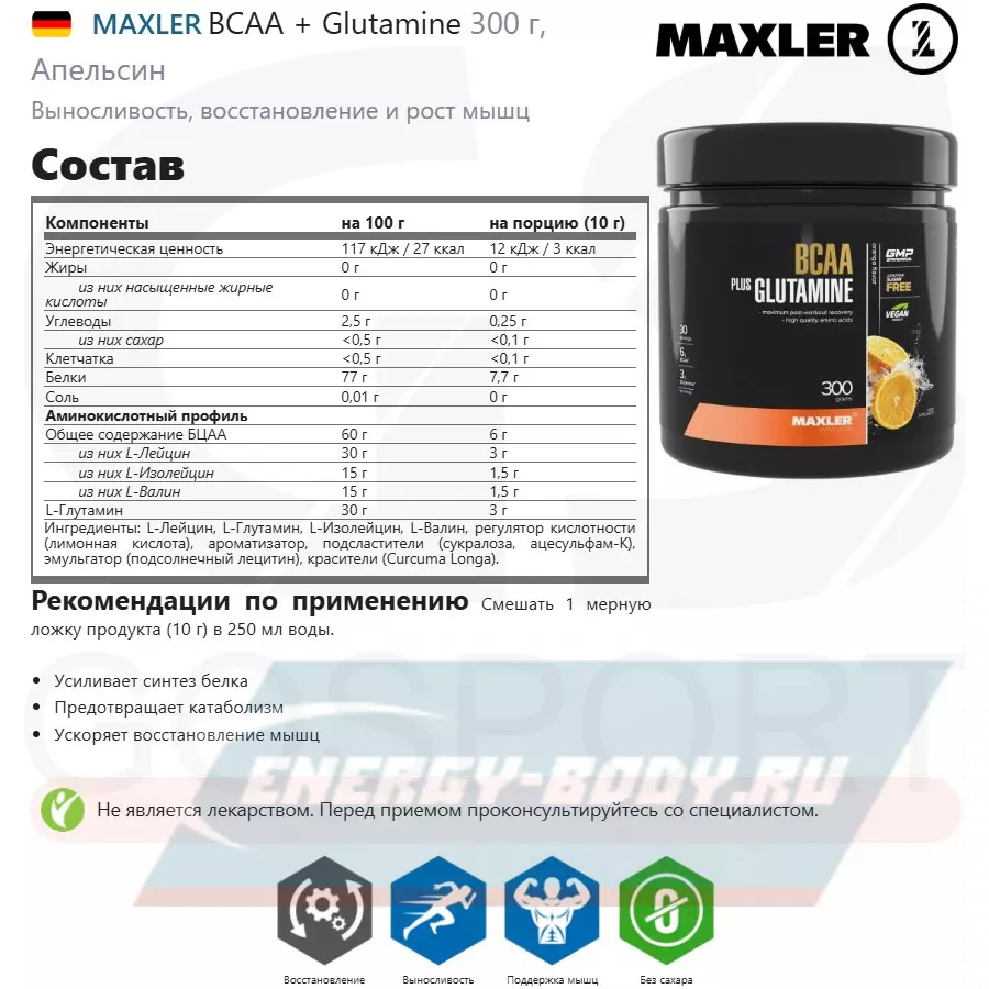 Поскольку Глутамин и БЦАА аминокислоты, которые играют важную роль в восстановлении мышц, то продукт Maxler BCAA+Glutamine отличная добавка для любого атлета.Данный продукт снабжает организм самой распространенной аминокислотой в организме человека - Глутамином, а также незаменимыми аминокислотами с разветвленными цепями – Лейцином, Валином и Изолейцином. Глутамин защищает мышцы от катаболизма, помогая нарастить и сохранить мышечную массу. BCAA играют важную роль в росте и развитии мышц, а также способствуют быстрому восстановлению после интенсивных физических нагрузок.