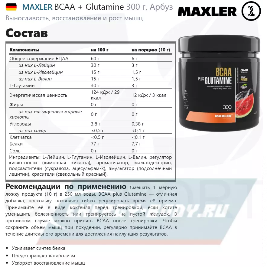 Поскольку Глутамин и БЦАА аминокислоты, которые играют важную роль в восстановлении мышц, то продукт Maxler BCAA+Glutamine отличная добавка для любого атлета.Данный продукт снабжает организм самой распространенной аминокислотой в организме человека - Глутамином, а также незаменимыми аминокислотами с разветвленными цепями – Лейцином, Валином и Изолейцином. Глутамин защищает мышцы от катаболизма, помогая нарастить и сохранить мышечную массу. BCAA играют важную роль в росте и развитии мышц, а также способствуют быстрому восстановлению после интенсивных физических нагрузок.