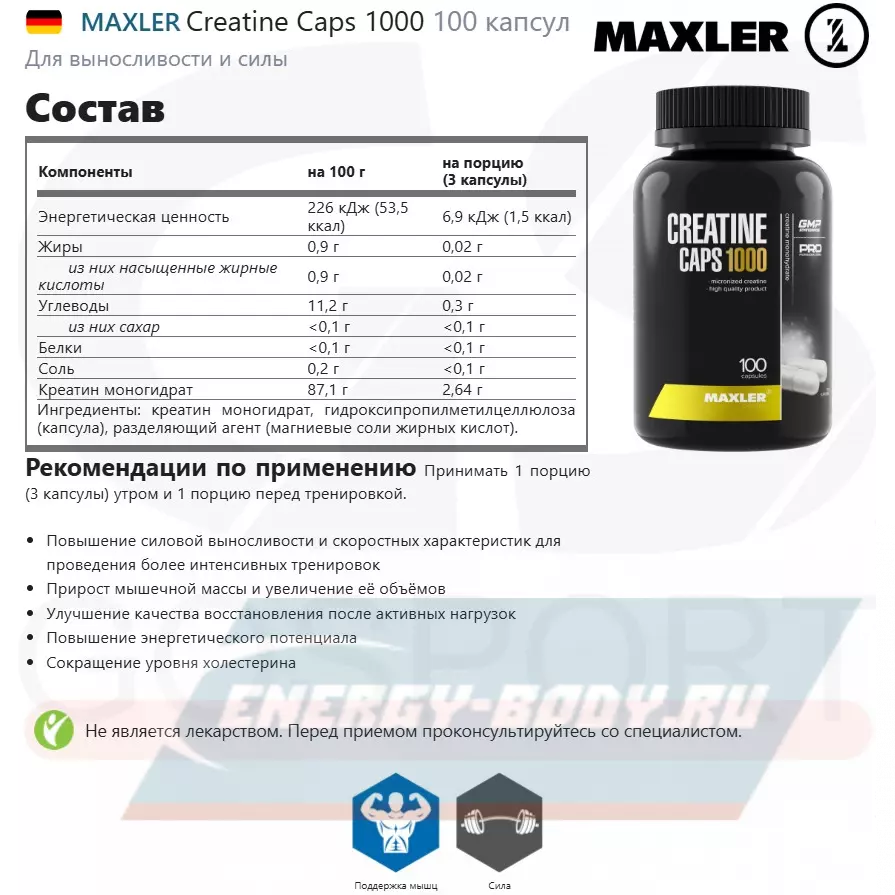 Creatine Caps 1000 – 100%-й моногидрат креатина в капсулированной форме. Моногидрат креатина характеризуется максимальным содержанием действующего вещества. Креатин способствует накоплению воды внутри мышечных волокон, повышению синтеза белка в организме и увеличению мускулатуры за счет большего показателя силы. Чем больше объем работы, тем больше прибавка массы и, как следствие, достижение заметного роста общей мышечной массы.