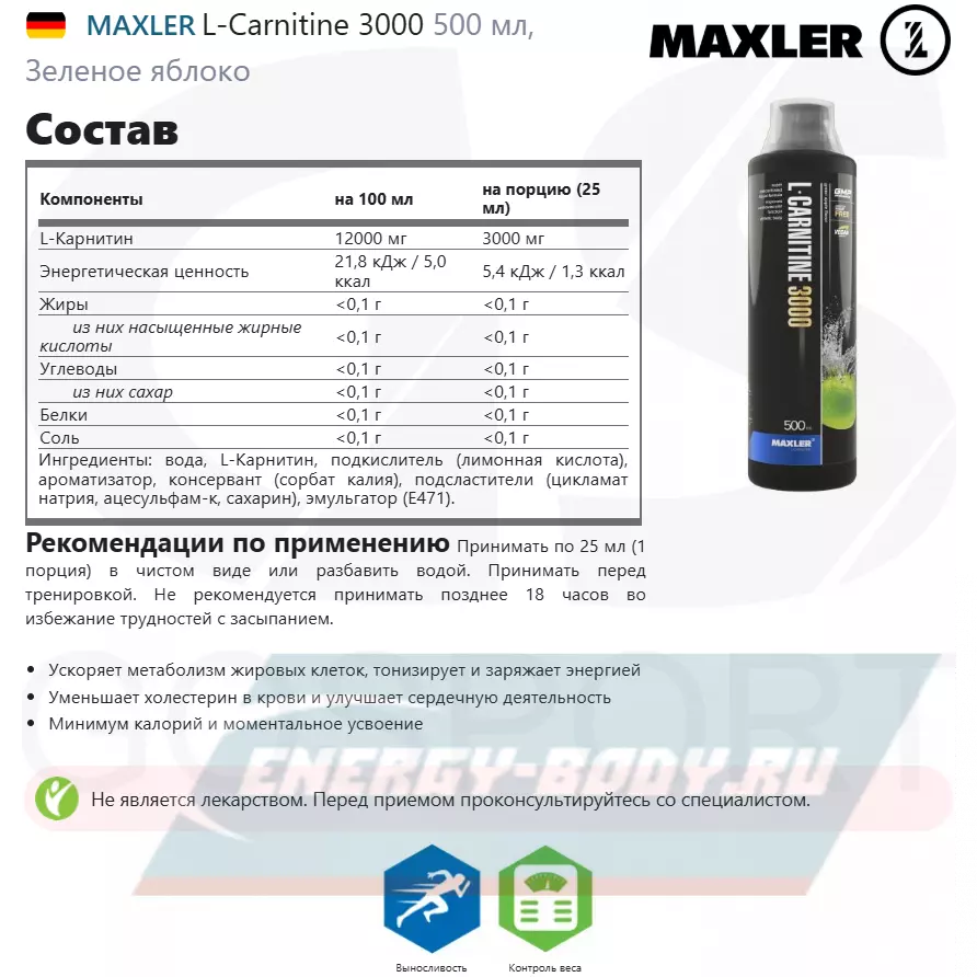Ингредиенты: вода, L-Карнитин, подкислитель (лимонная кислота), ароматизатор, консервант (сорбат калия), подсластители (цикламат натрия, ацесульфам-к, сахарин), эмульгатор (Е471).