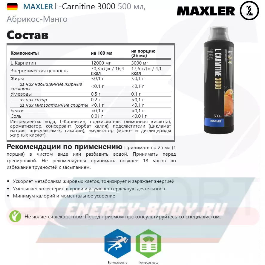 Ингредиенты: вода, L-Карнитин, подкислитель (лимонная кислота), ароматизатор, консервант (сорбат калия), подсластители (цикламат натрия, ацесульфам-k, сахарин), эмульгатор (моно- и диглицериды жирных кислот).