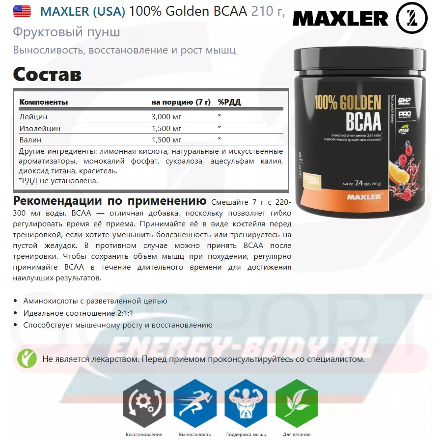 100% Golden BCAA – это мощная формула, содержащая аминокислоты с разветвленными цепями (BCAA) в классическом соотношении 2:1:1 (L-Лейцин, L-Изолейцин, L-Валин). BCAA – основной материал для построения мышц.