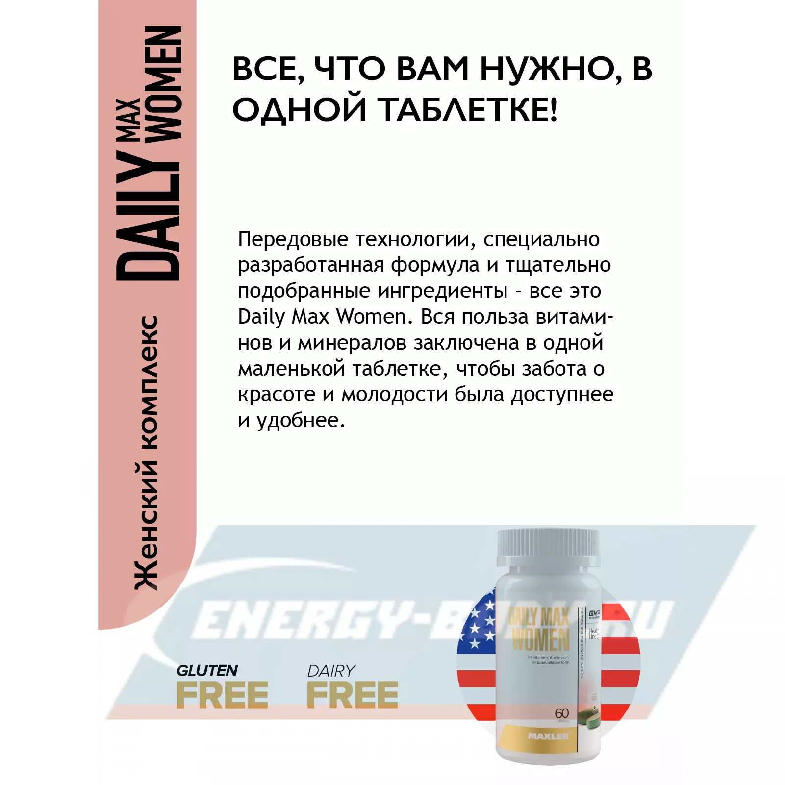 Daily Max Women поддерживает состояние кожи и костно-мышечной системы. Сочетание кальция, магния, витамина D с комплексом мощных антиоксидантов (витамин С, молибден, витамин A) обеспечивают прочность костей, силу и упругость, а также хорошее состояние кожи.