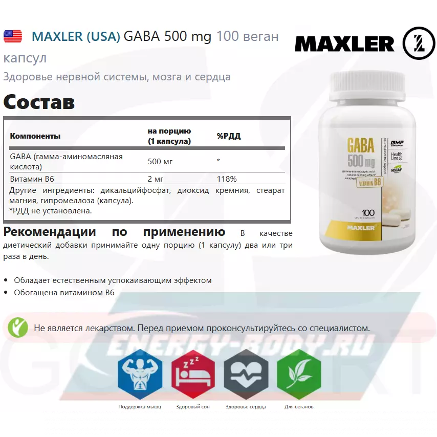 MAXLER GABA 500 mg 100 веган капсул — Здоровье нервной системы, мозга и сердца