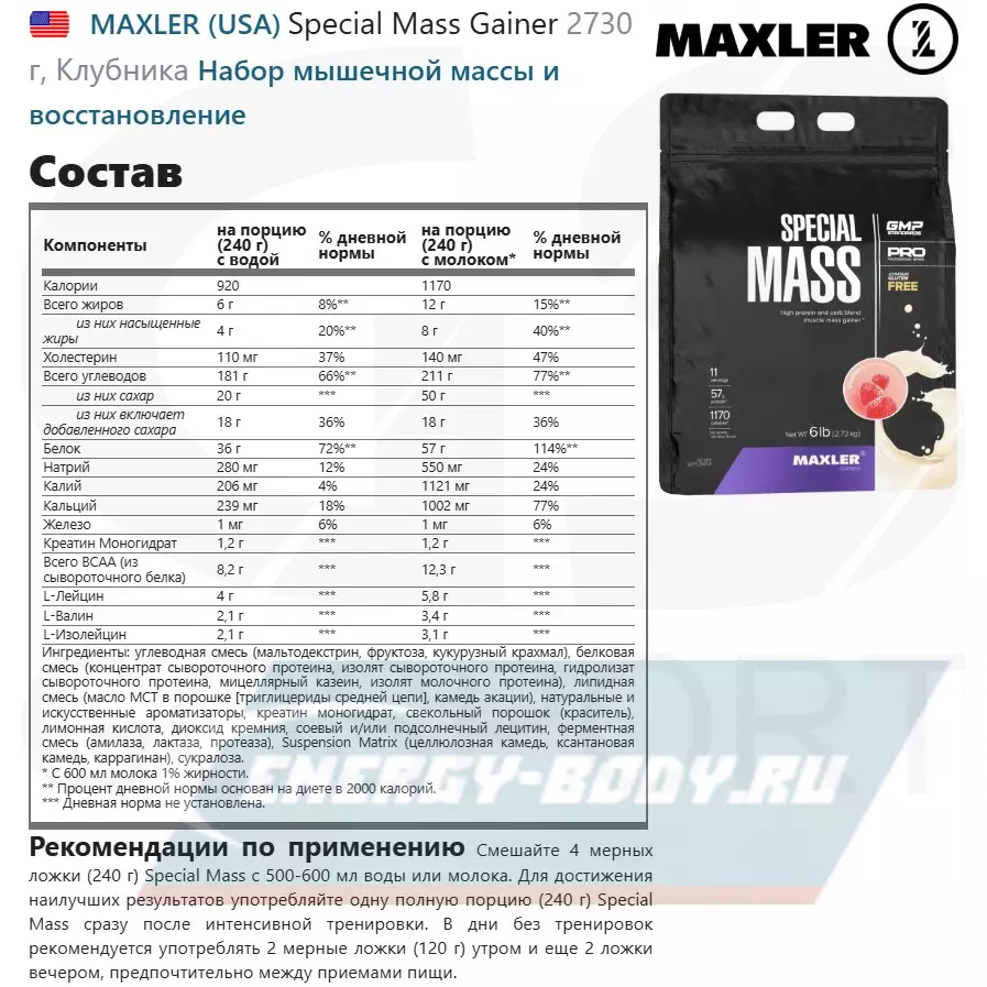 Рекомендации по применению Смешайте 4 мерных ложки (240 г) Special Mass с 500-600 мл воды или молока. Для достижения наилучших результатов употребляйте одну полную порцию (240 г) Special Mass сразу после интенсивной тренировки. В дни без тренировок рекомендуется употреблять 2 мерные ложки (120 г) утром и еще 2 ложки вечером, предпочтительно между приемами пищи.