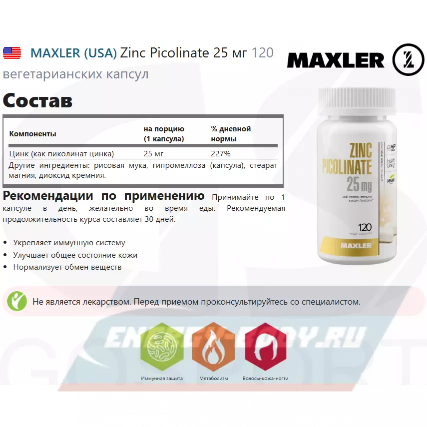 Цинк (как пиколинат цинка) | 25 мг | 227% |