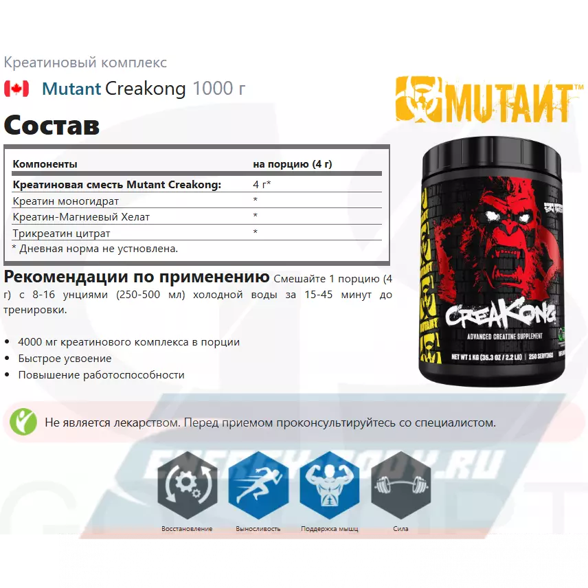 Креатиновый комплекс Creakong от канадского бренда Mutant представляет собой чистую смесь наиболее популярных запатентованных и клинически изученных видов креатина – креатин моногидрат Creapure, креатин Magnapower (магний креатин хелат) и трикреатин цитрат. За счет качественной энергетической подпитки мышечных тканей продукт эффективно поможет нарастить мышечную массу, увеличить силу и повысить выносливость.