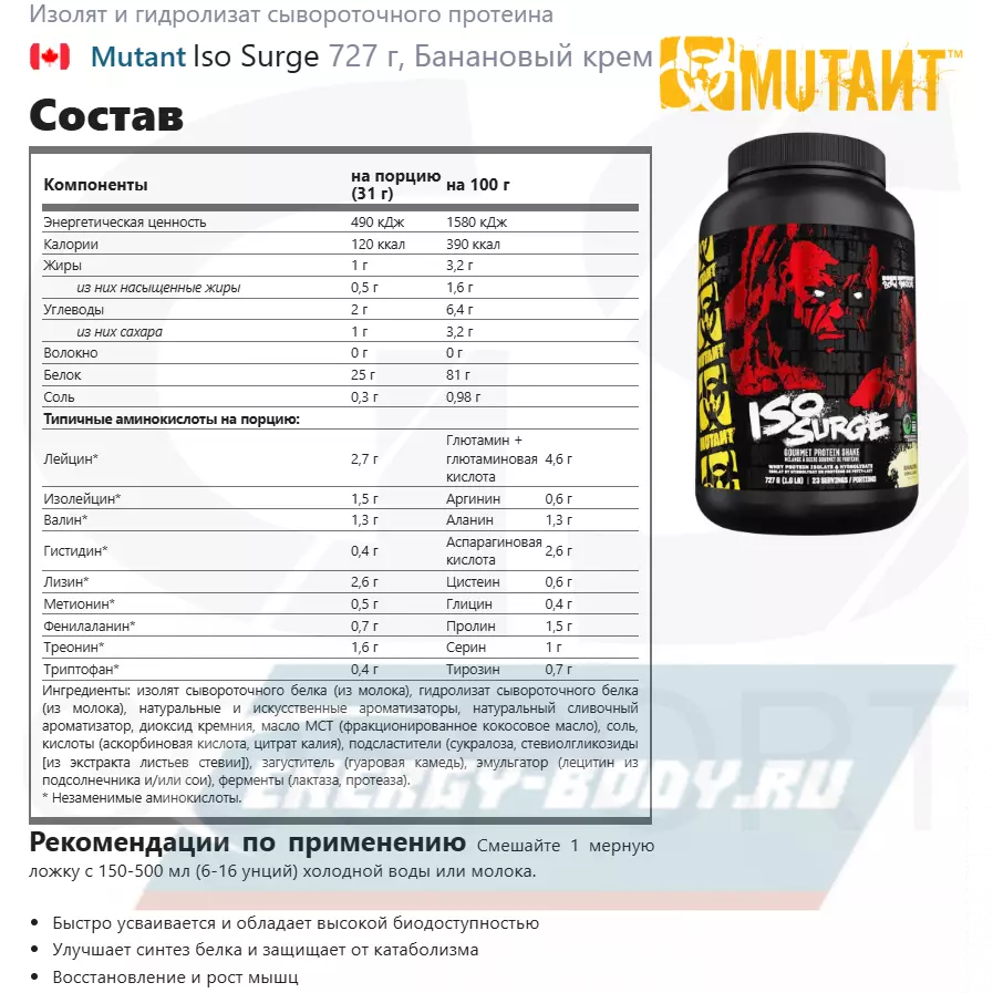 Формула Iso Surge от Mutant разработана на основе быстро действующих сывороточного изолята и сывороточного гидролизата. Данные белки имеют полный аминокислотный профиль и высокую биологическую ценность. Поэтому потребляя их, вы сможете поставлять строительный материал в мышцы за короткий промежуток времени, что необходимо до и после тренировки для предупреждения катаболических процессов и поддержания мышечного роста. К тому же вы поддержите восстановление своего организма, что лучше подготовит его к следующей тренировке. В каждой порции данного протеина содержится 25 г белка и по 1 г жиров и углеводов, поэтому его можно применять во время сушки или диеты.