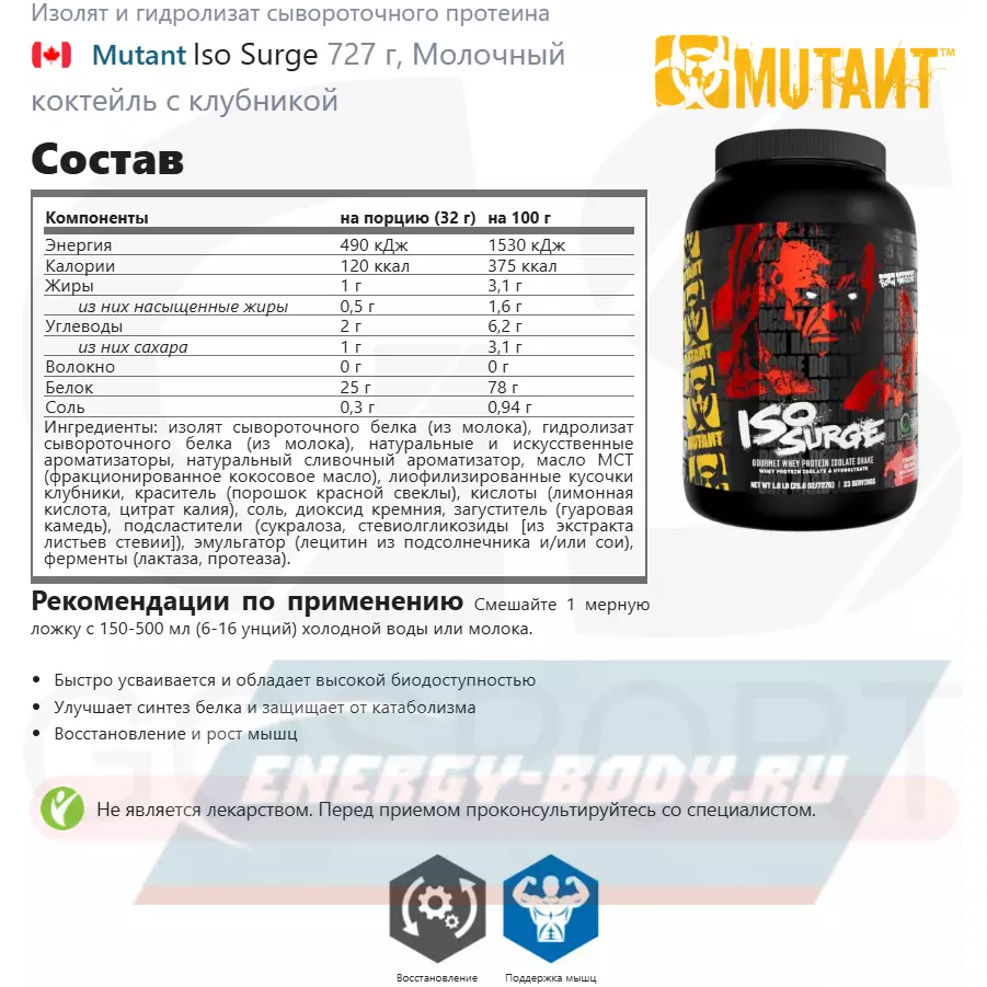 Формула Iso Surge от Mutant разработана на основе быстро действующих сывороточного изолята и сывороточного гидролизата. Данные белки имеют полный аминокислотный профиль и высокую биологическую ценность. Поэтому потребляя их, вы сможете поставлять строительный материал в мышцы за короткий промежуток времени, что необходимо до и после тренировки для предупреждения катаболических процессов и поддержания мышечного роста. К тому же вы поддержите восстановление своего организма, что лучше подготовит его к следующей тренировке. В каждой порции данного протеина содержится 25 г белка и по 1 г жиров и углеводов, поэтому его можно применять во время сушки или диеты.