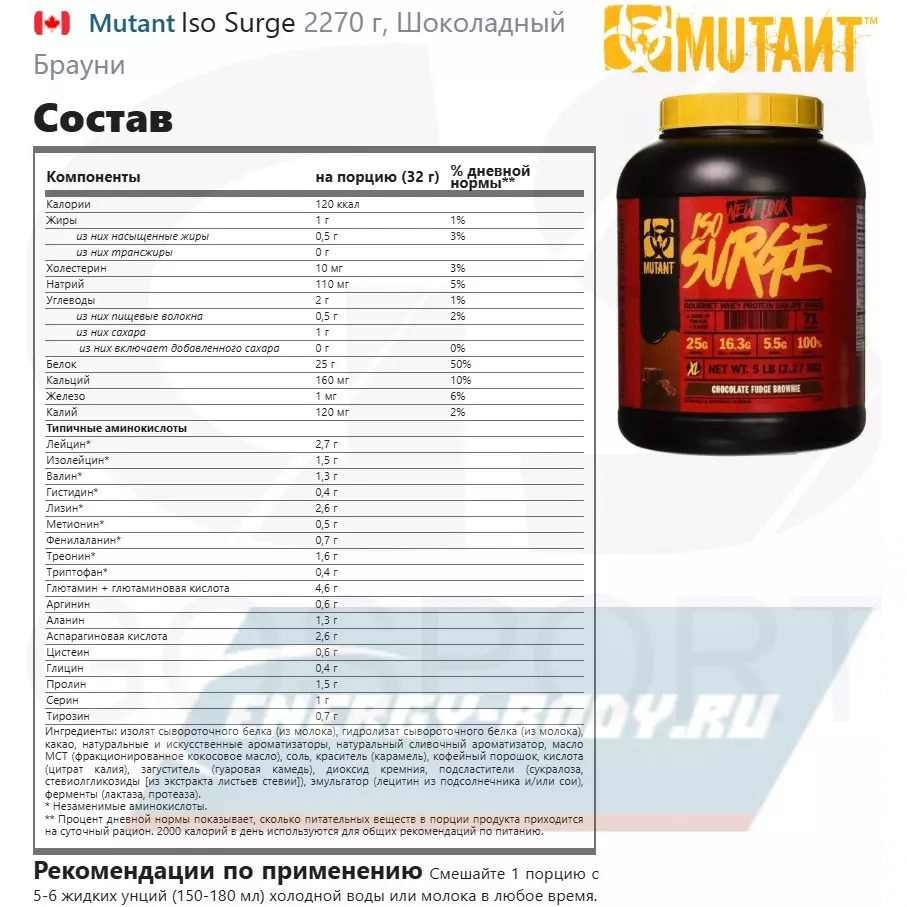 Формула Iso Surge от Mutant разработана на основе быстро действующих сывороточного изолята и сывороточного гидролизата. Данные белки имеют полный аминокислотный профиль и высокую биологическую ценность. Поэтому потребляя их, вы сможете поставлять строительный материал в мышцы за короткий промежуток времени, что необходимо до и после тренировки для предупреждения катаболических процессов и поддержания мышечного роста. К тому же вы поддержите восстановление своего организма, что лучше подготовит его к следующей тренировке. В каждой порции данного протеина содержится 25 г белка и по 1 г жиров и углеводов, поэтому его можно применять во время сушки или диеты.