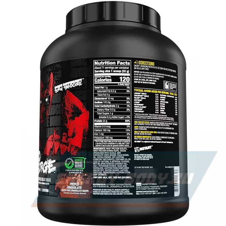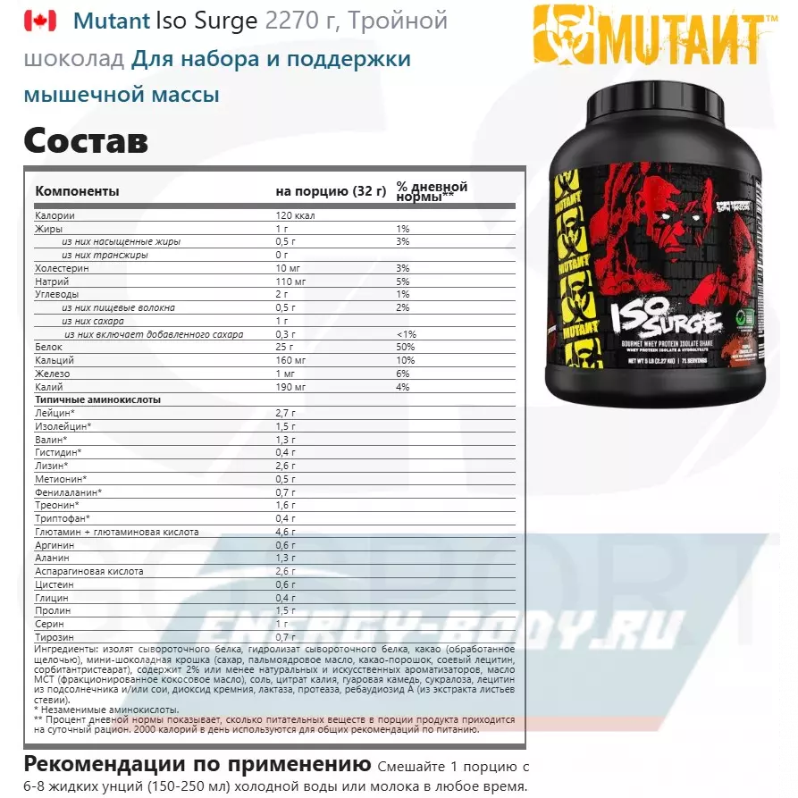 Формула Iso Surge от Mutant разработана на основе быстро действующих сывороточного изолята и сывороточного гидролизата. Данные белки имеют полный аминокислотный профиль и высокую биологическую ценность. Поэтому потребляя их, вы сможете поставлять строительный материал в мышцы за короткий промежуток времени, что необходимо до и после тренировки для предупреждения катаболических процессов и поддержания мышечного роста. К тому же вы поддержите восстановление своего организма, что лучше подготовит его к следующей тренировке. В каждой порции данного протеина содержится 25 г белка и по 1 г жиров и углеводов, поэтому его можно применять во время сушки или диеты.
