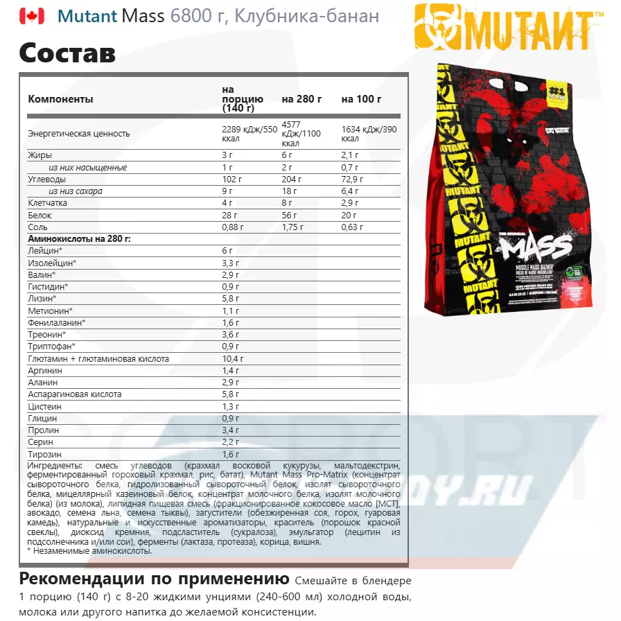 Ингредиенты: смесь углеводов (крахмал восковой кукурузы, мальтодекстрин, ферментированный гороховый крахмал, рис, батат), Mutant Mass Pro-Matrix (концентрат сывороточного белка, гидролизованный сывороточный белок, изолят сывороточного белка, мицеллярный казеиновый белок, концентрат молочного белка, изолят молочного белка) (из молока), липидная пищевая смесь (фракционированное кокосовое масло [MCT], авокадо, семена льна, семена тыквы), загустители (обезжиренная соя, горох, гуаровая камедь), натуральные и искусственные ароматизаторы, краситель (порошок красной свеклы), диоксид кремния, подсластитель (сукралоза), эмульгатор (лецитин из подсолнечника и/или сои), ферменты (лактаза, протеаза), корица, вишня.