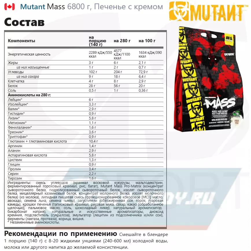 Ингредиенты: смесь углеводов (крахмал восковой кукурузы, мальтодекстрин, ферментированный гороховый крахмал, рис, батат), Mutant Mass Pro-Matrix (концентрат сывороточного белка, гидролизованный сывороточный белок, изолят сывороточного белка, мицеллярный казеиновый белок, концентрат молочного белка, изолят молочного белка) (из молока), липидная пищевая смесь (фракционированное кокосовое [MCT] масло, авокадо, семена льна, семена тыквы), загустители (обезжиренная соя, горох, гуаровая камедь), крошки печенья (тапиоковый крахмал, рисовая мука, сахар, какао [обработанное щелочью], пальмовое масло, соль, шоколадный ликер, натуральный ароматизатор, бикарбонат натрия), натуральные и искусственные ароматизаторы, диоксид кремния, подсластитель (сукралоза), эмульгатор (лецитин из подсолнечника и/или сои), ферменты (лактаза, протеаза), корица, вишня.