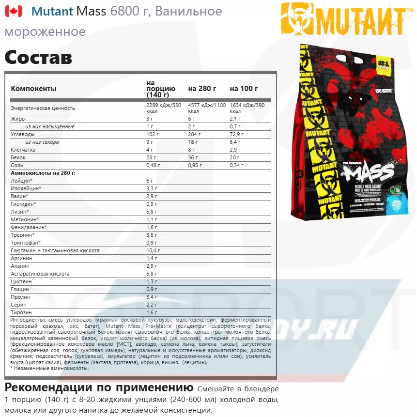 Основными источниками углеводов, содержащимися в гейнере Mutant Mass, являются восковая кукуруза и крахмал восковидного ячменя, которые абсорбируются в желудочно-кишечном тракте быстрее, чем другие источники углеводов. Mutant Mass также содержит мальтодекстрин (сложный источник углеводов), необходимый для длительного снабжения мышц энергией.