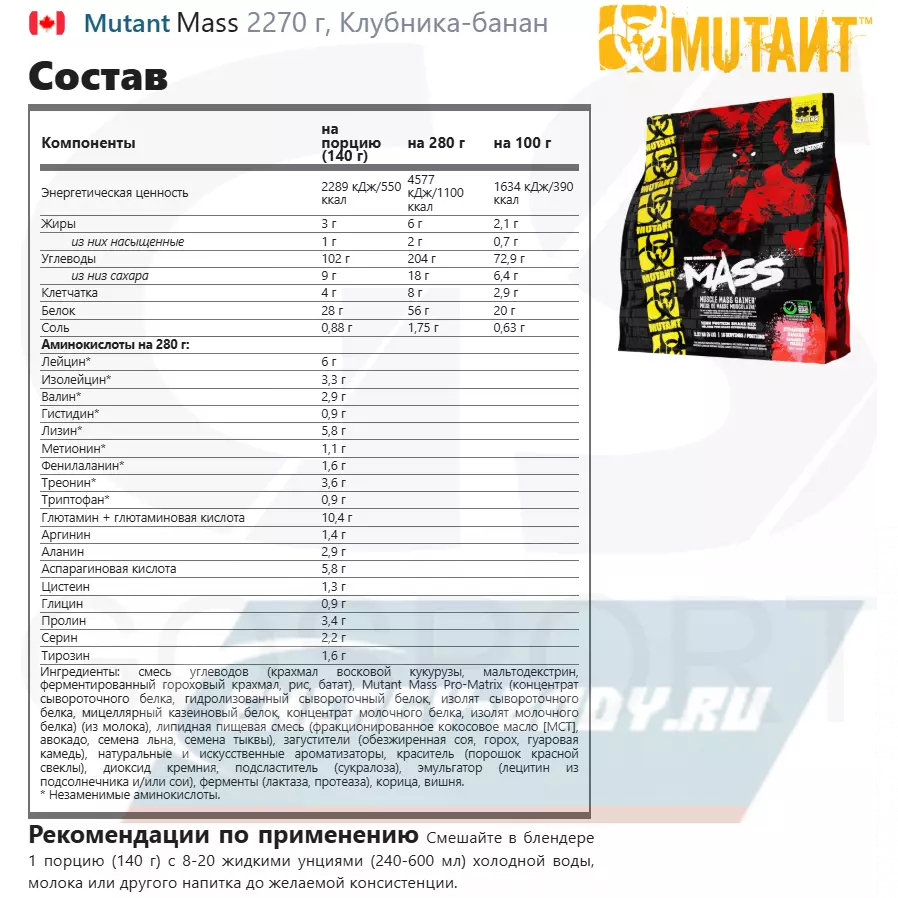 Ваше тело нуждается в избытке калорий, чтобы расти! Однако, если вы хотите набрать сухую мышечную массу, то должны убедиться, что принимаете «качественные» калории и питательные вещества. Ряд научных исследований показал, что прибавка от 1000 до 2000 калорий в день к вашему обычному рациону и программе тренировок может привести к существенному увеличению сухой мышечной массы и силы! Однако, вы должны остерегаться получения дополнительных калорий из любого традиционного источника, иначе все закончится тем, что вы приобретёте больше жировых отложений, чем мышечной массы. MUTANT MASS разработан на основе научных подходов для стимуляции быстрого набора сухой мышечной массы. Он снабжает организм отличным сочетанием белков, углеводов и полезных жиров и другими анаболиками, необходимыми для максимального роста мышц, увеличения силы и восстановления. Используя MUTANT MASS, вы можете быть спокойны, что быстро наберёте «качественную» массу!