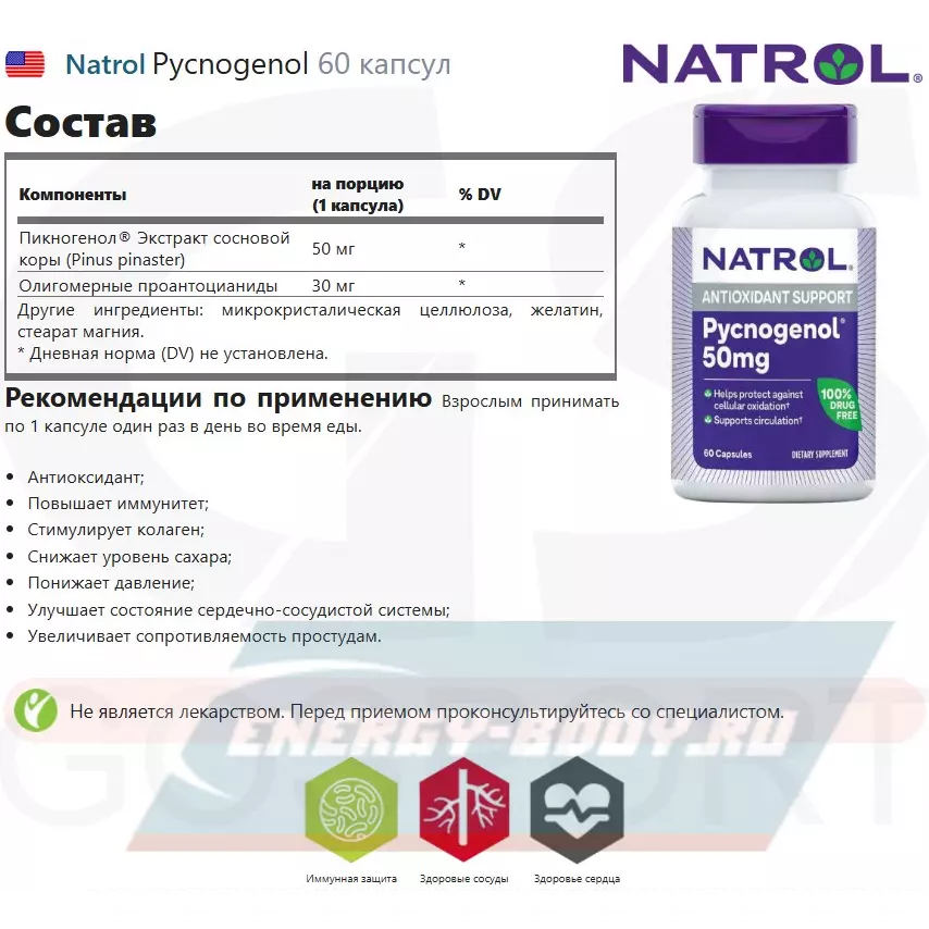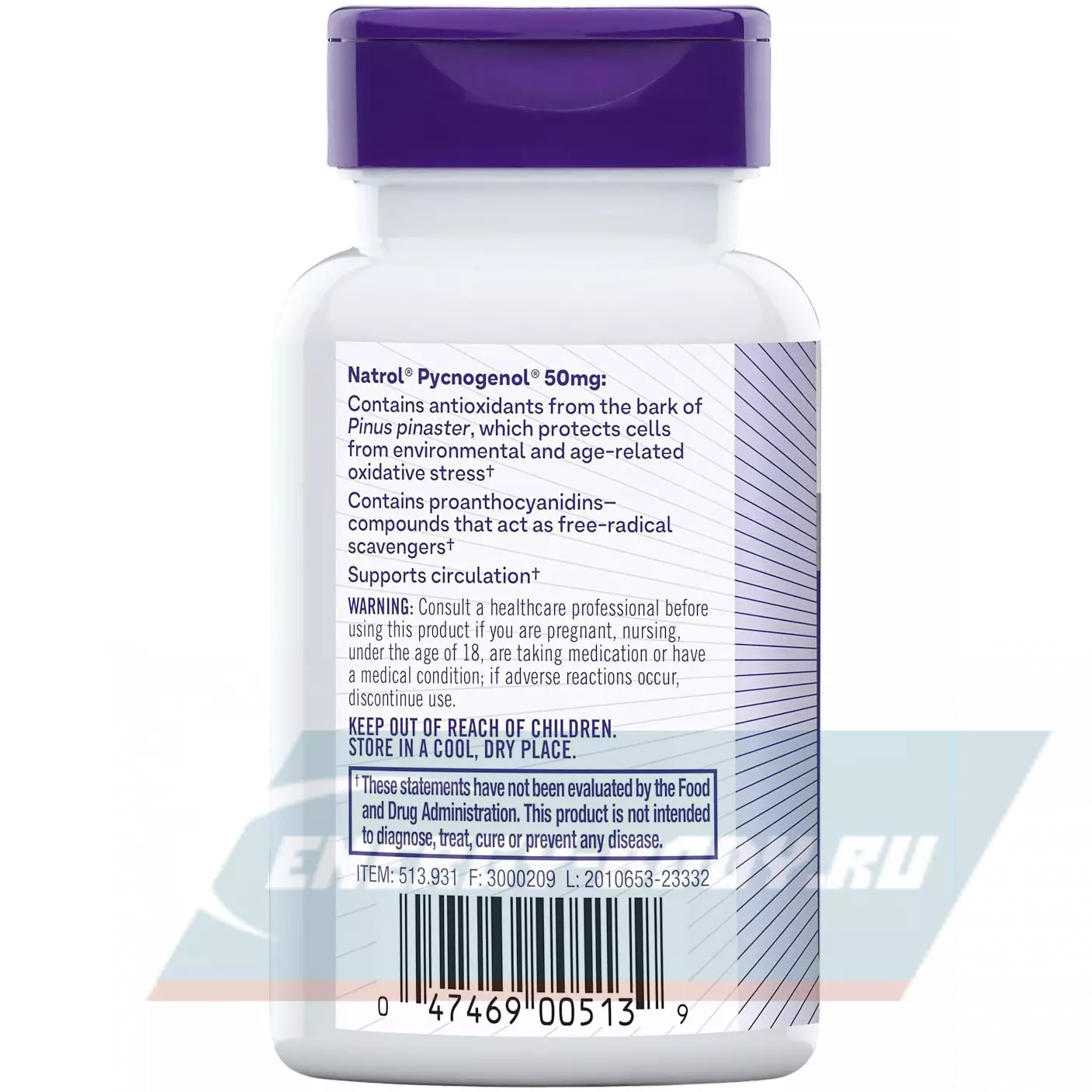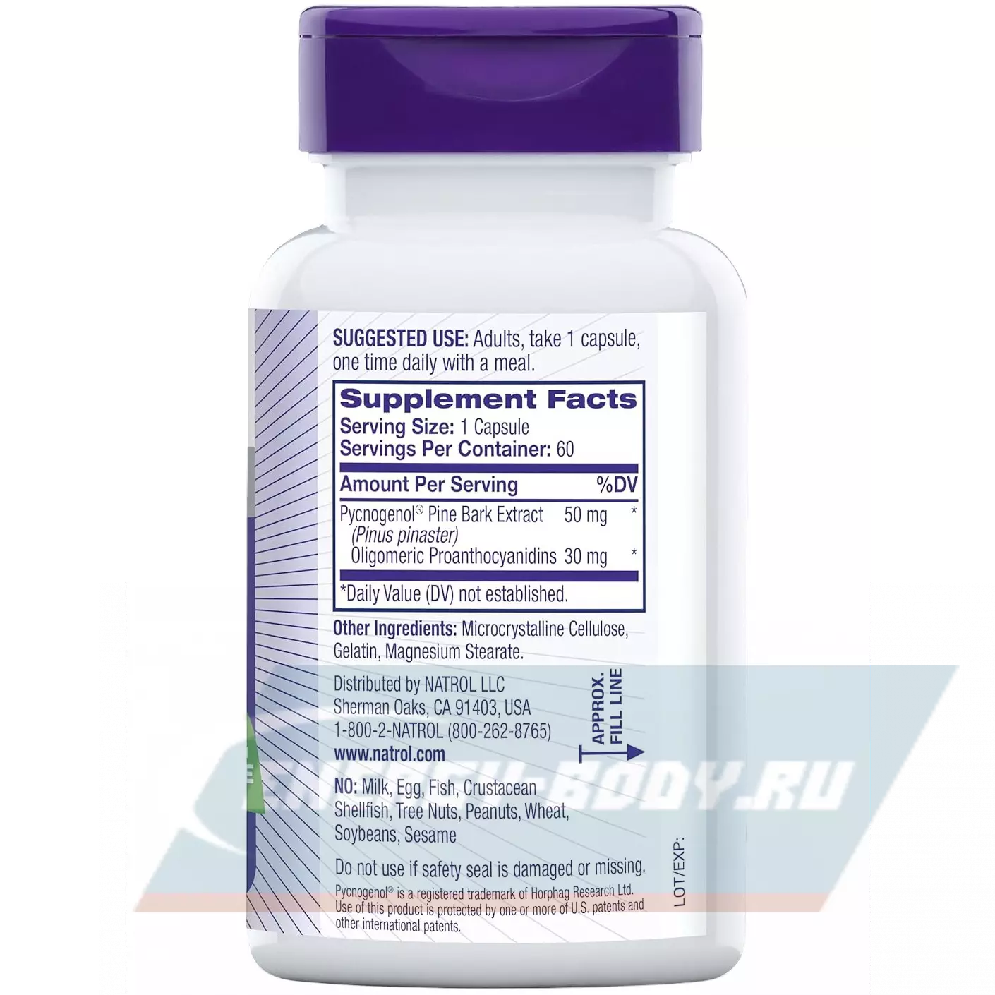 NATROL Pycnogenol 50 mg мощный антиоксидант и противовоспалительное средство из экстрактов морской французской сосны.Pycnogenol получен из коры сосны, которая произрастает в экологически чистом районе, на закрытой территории, под контролем биологов возле моря, на юго-западе Франции.При выращивании данного вида сосны не используются никакие химические препараты и геомодифицированные продукты.